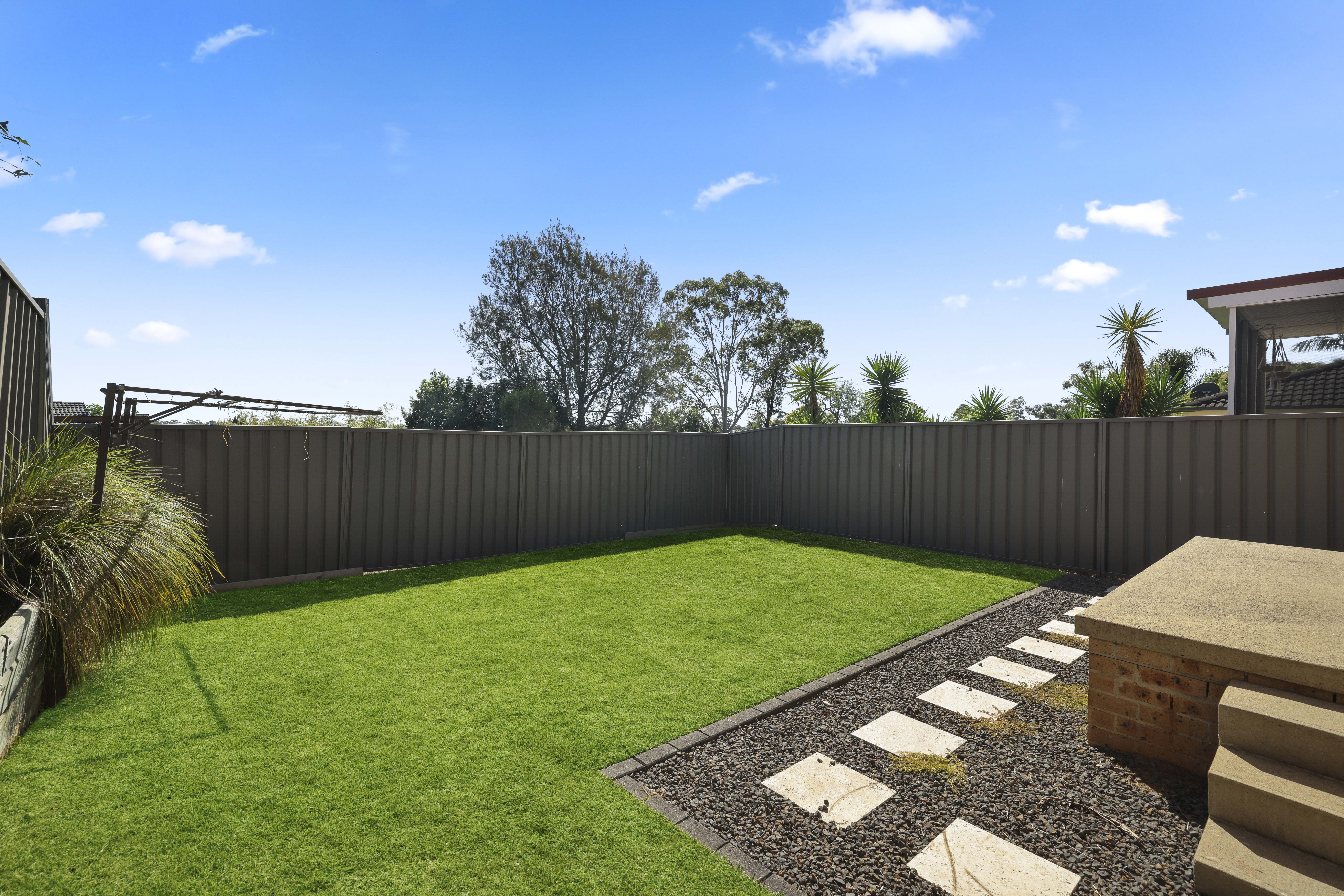 - Secure sunlit and low maintenance backyard, mainly laid to lawn