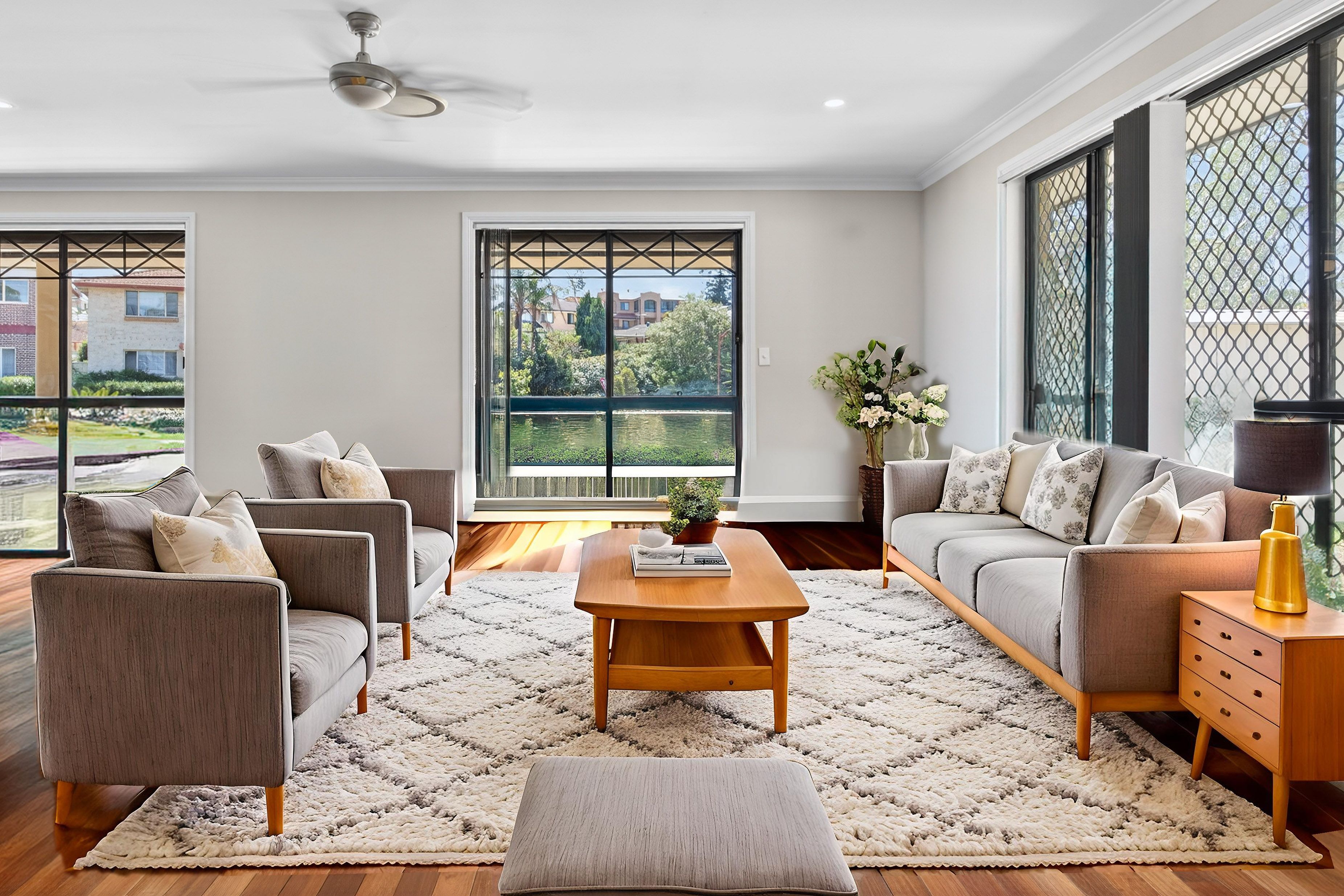 - Downlights, vertical blinds, and neutral tones throughout