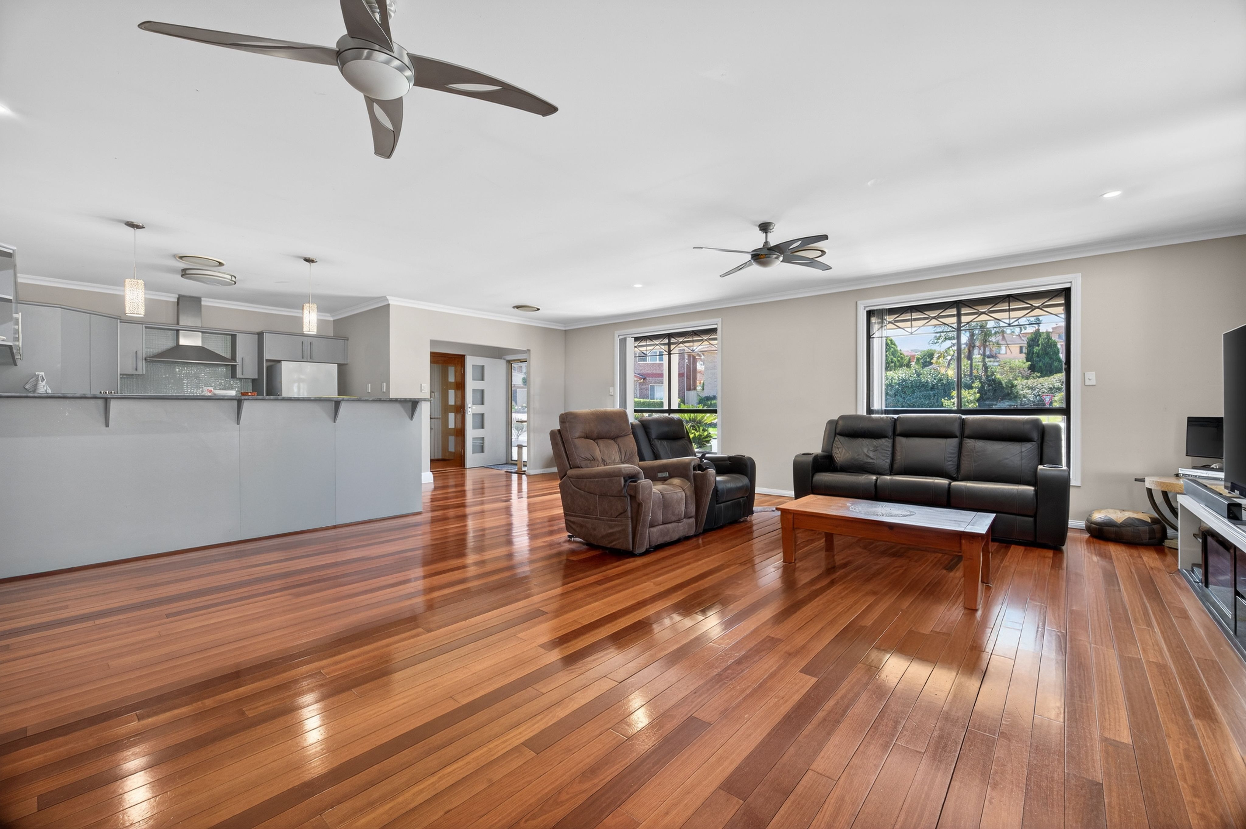 The heart of the home is the open-plan living, dining, and kitchen area, bathed in gorgeous natural light and enhanced by high ceilings, timber flooring throughout, ducted air conditioning, ceiling fans, downlights, and vertical blinds.