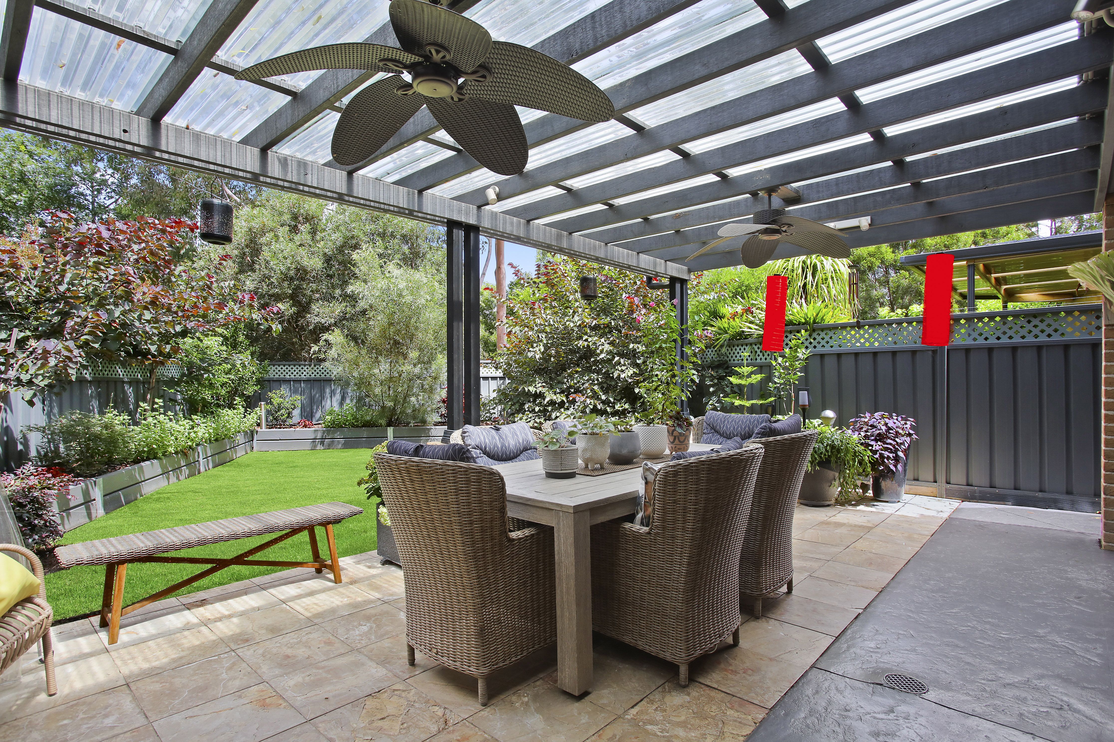- Sun drenched child-friendly backyard complete with established trees and gardens