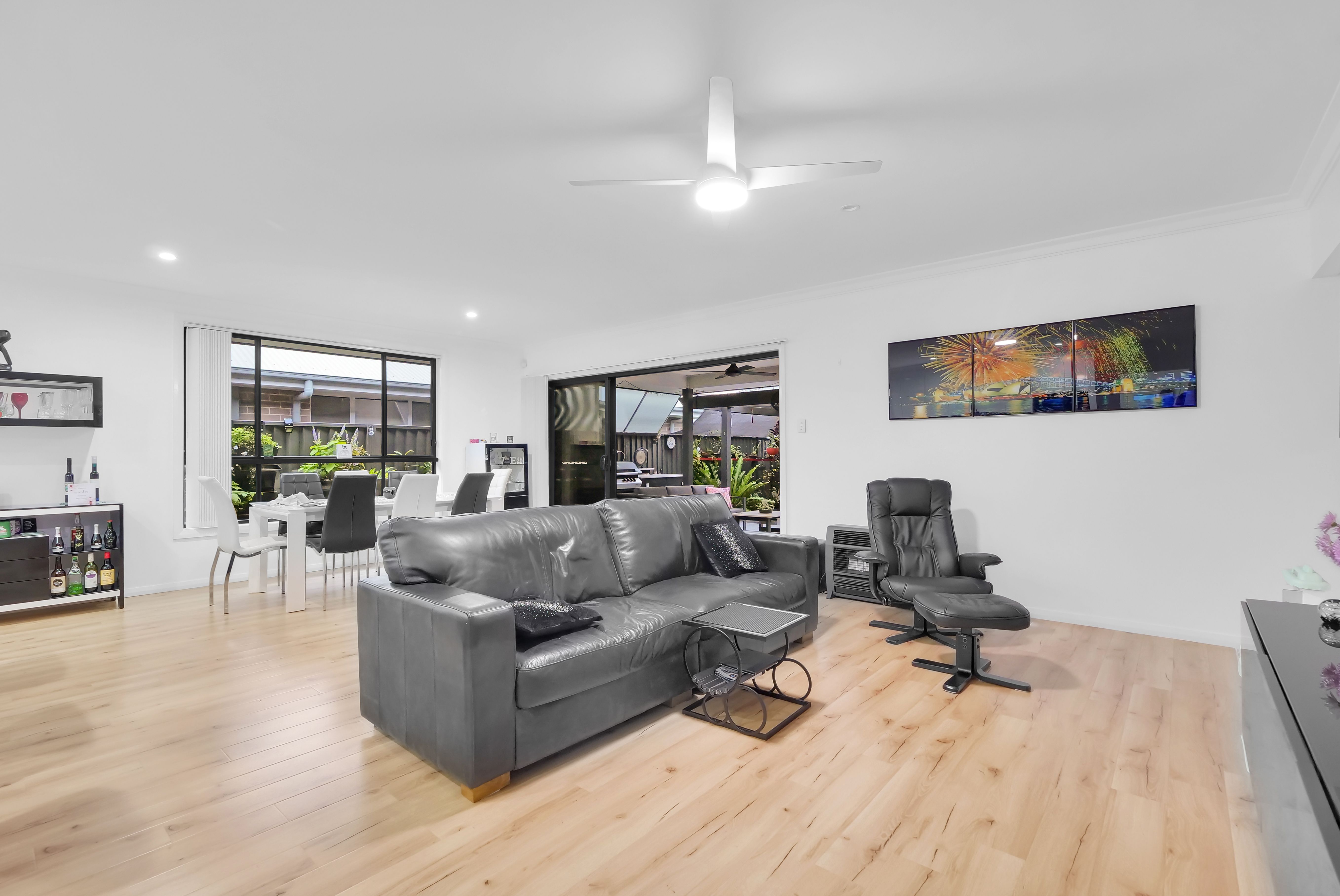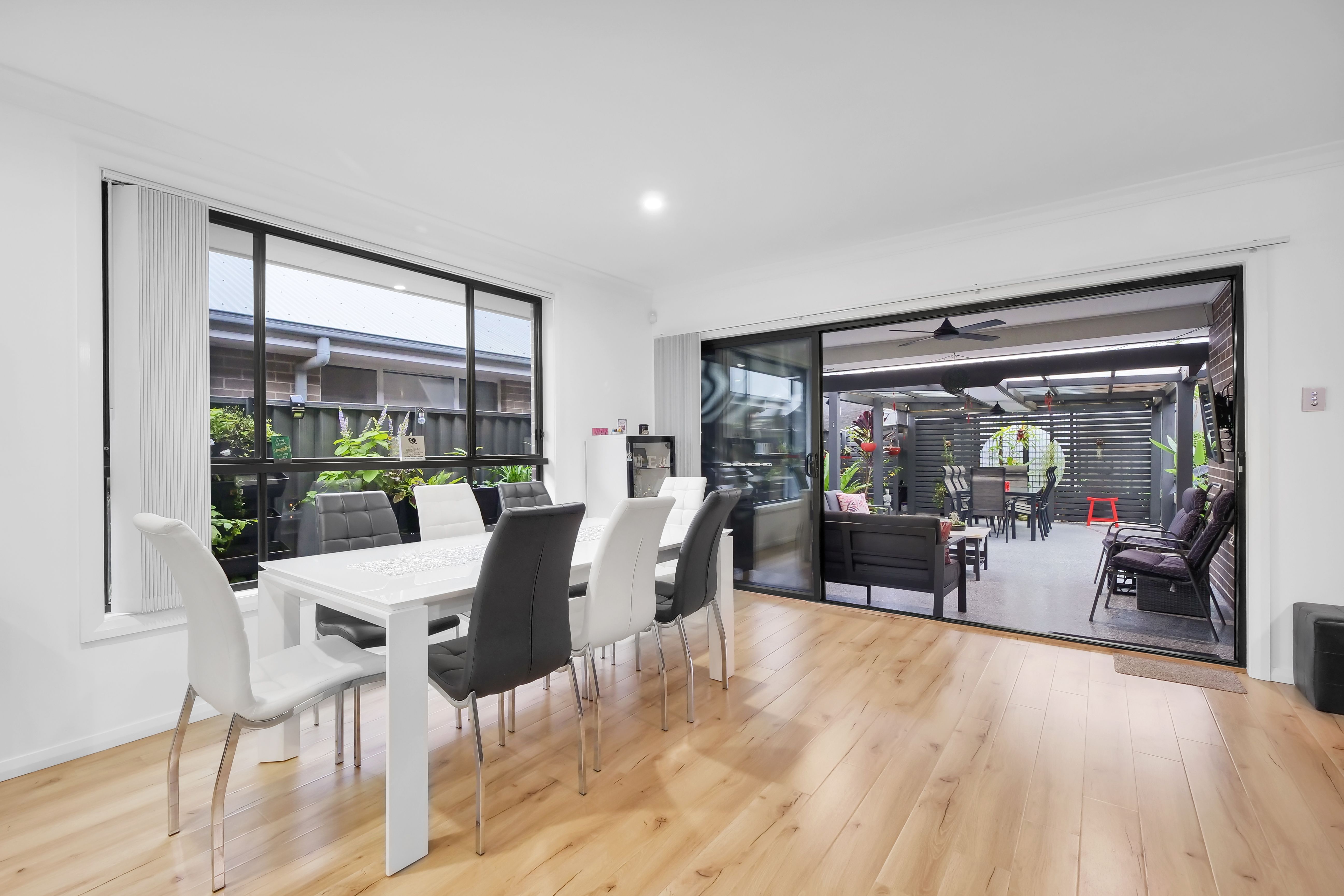 - Open plan living and dining spaces with spotted gum laminate flooring flowing seamlessly to outdoor area