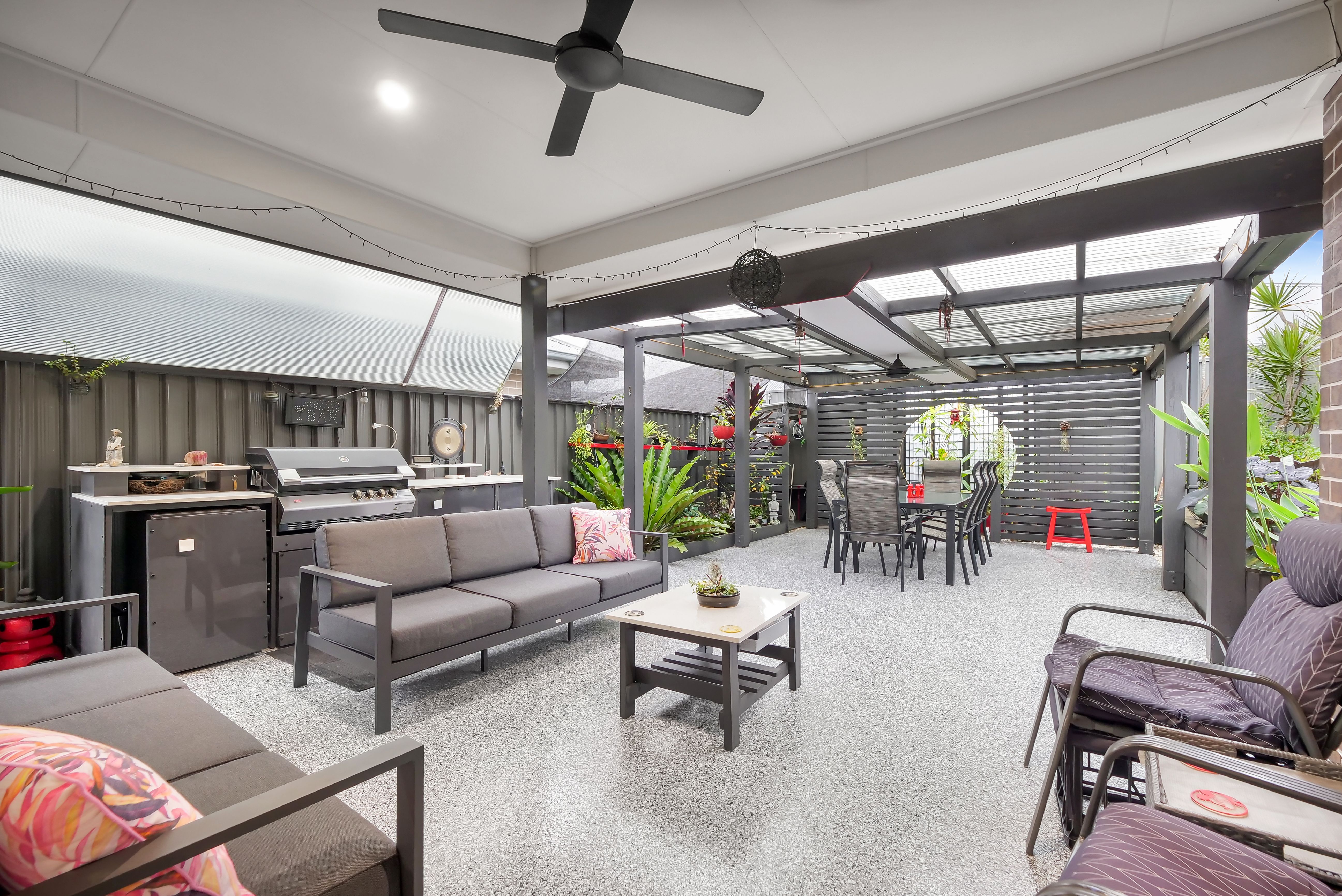 - Undercover alfresco area with an extended private covered outdoor area with custom built barbecue, overlooking beautiful gardens and fishpond