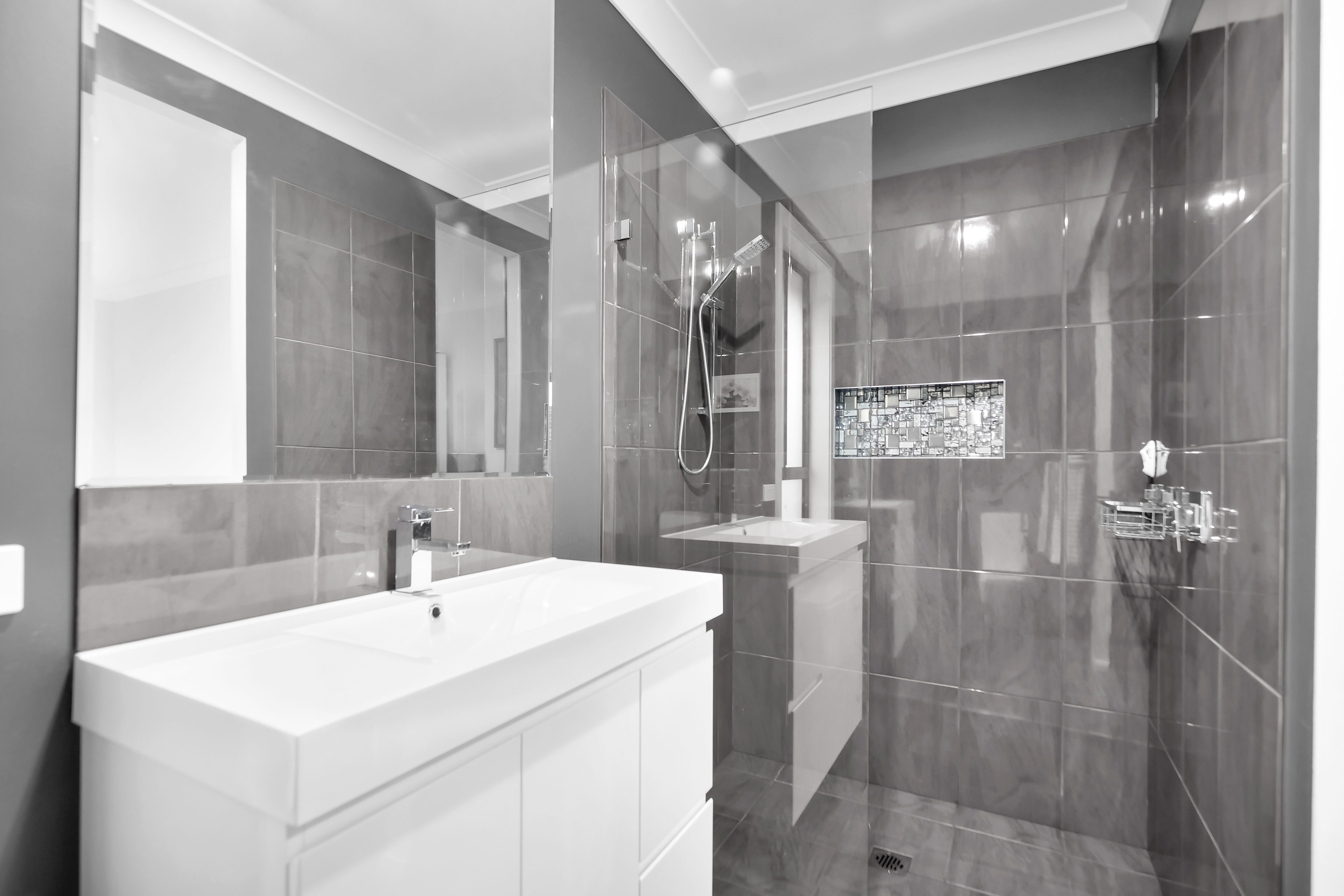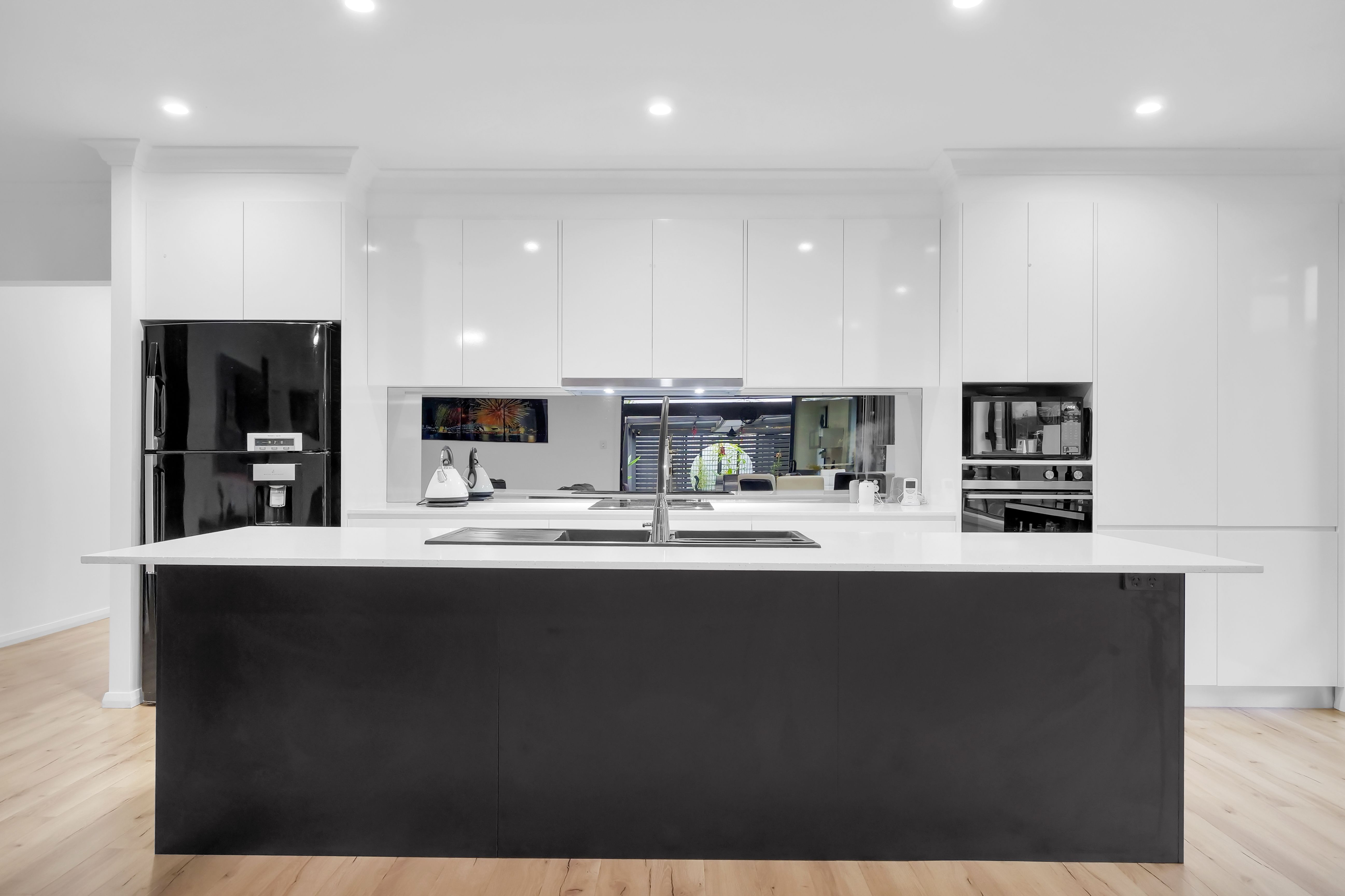 - A sleek and modern kitchen with stone benchtops, mirror splashback and premium cooking appliances