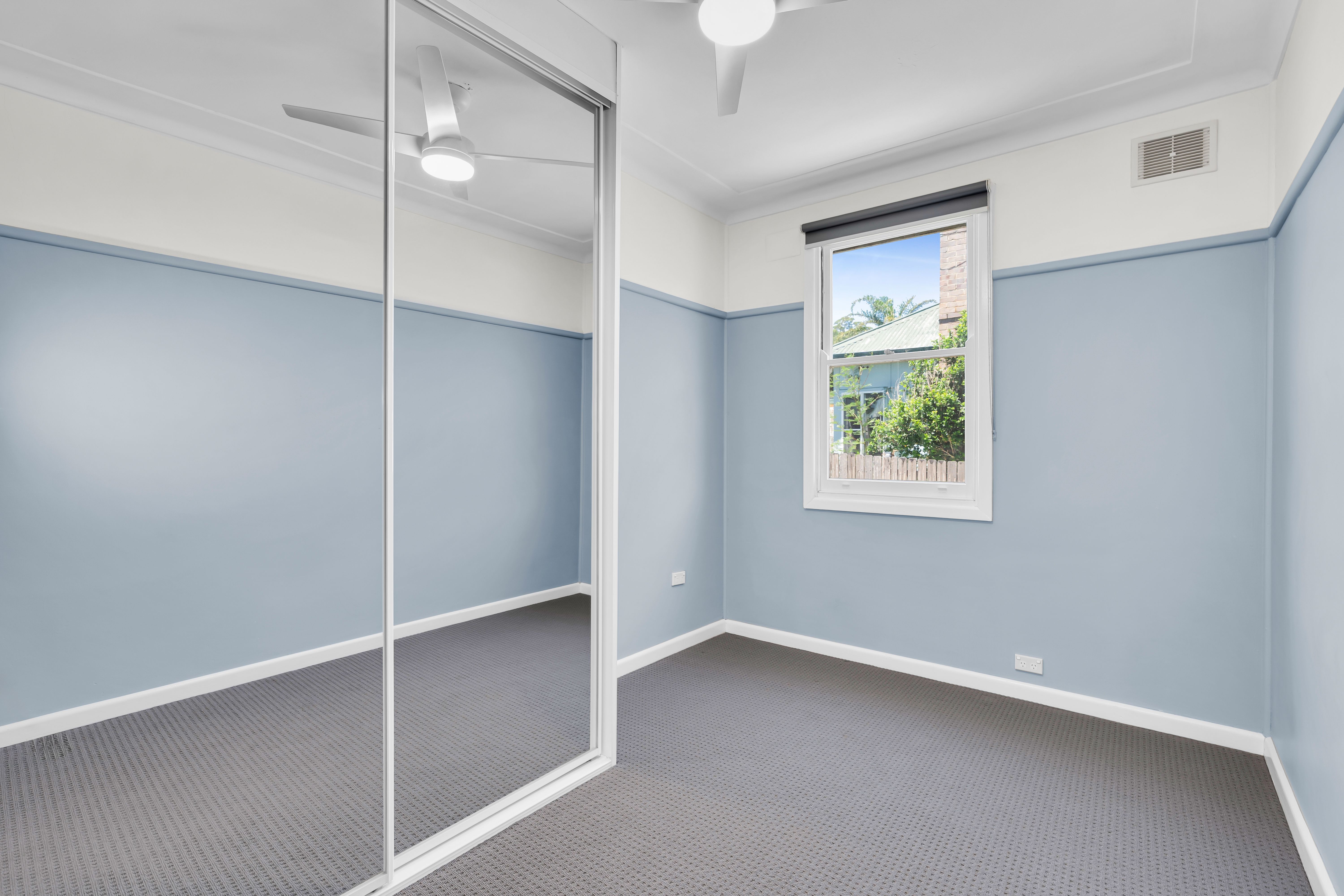 All three bedrooms are carpeted and come equipped with mirrored built-in robes and ceiling fans with lights, offering comfortable and stylish accommodation for the whole family. The bathroom includes a bathtub, separate standing shower, single-sink vanity, WC, exhaust fan and tasteful floor-to-ceiling tiling.