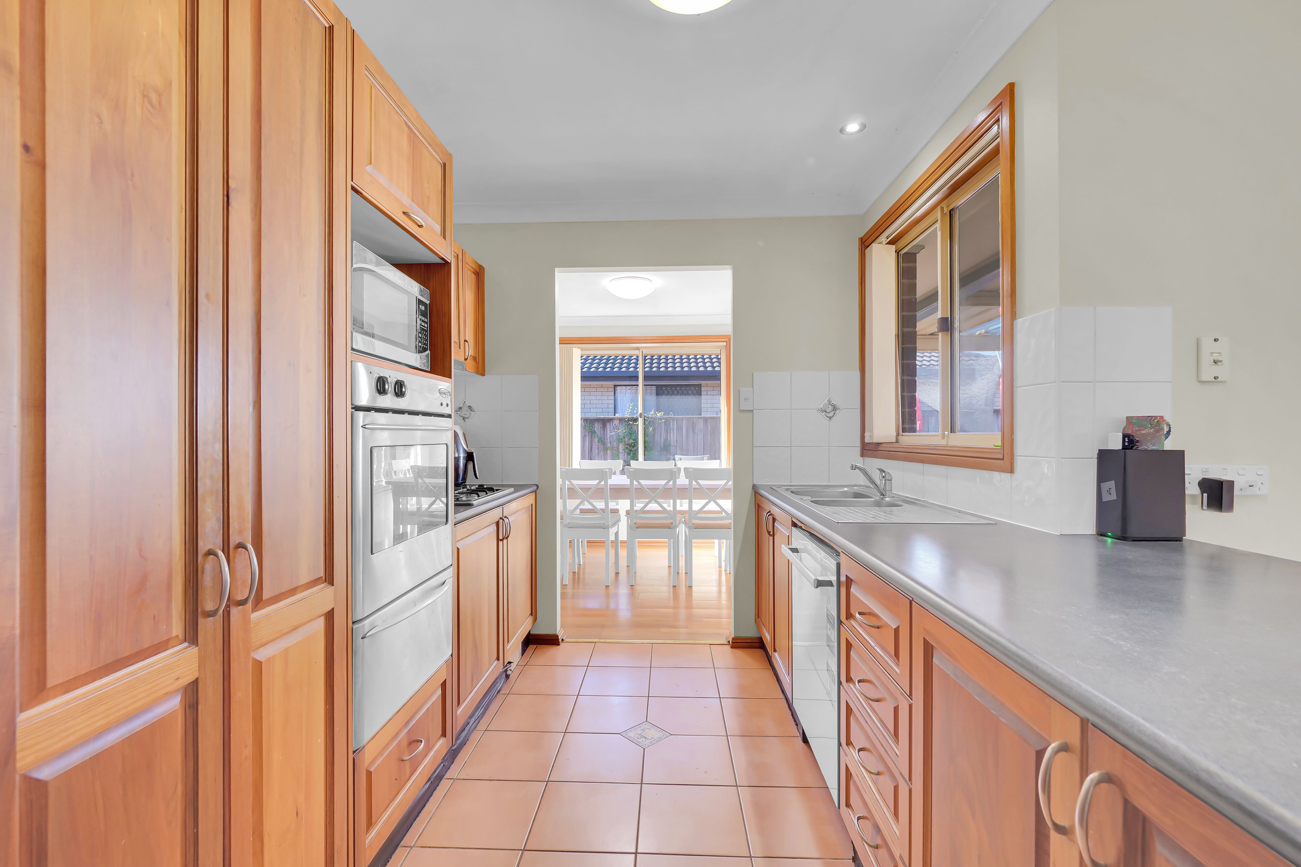 - Neat and tidy galley-style kitchen with wall oven, gas cooking, rangehood and dishwasher