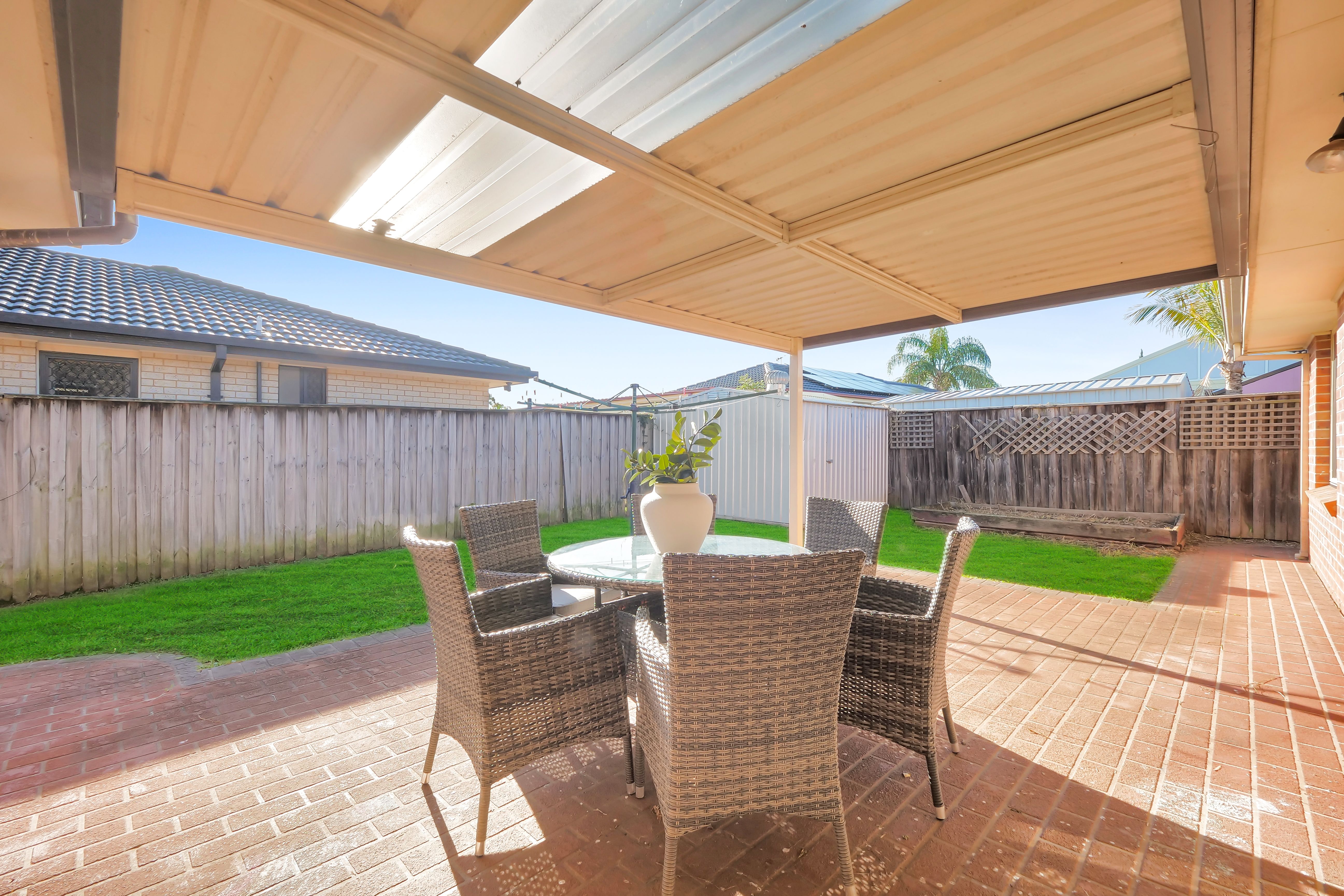 - Undercover outdoor entertaining area overlooking low maintenance gardens, garden shed