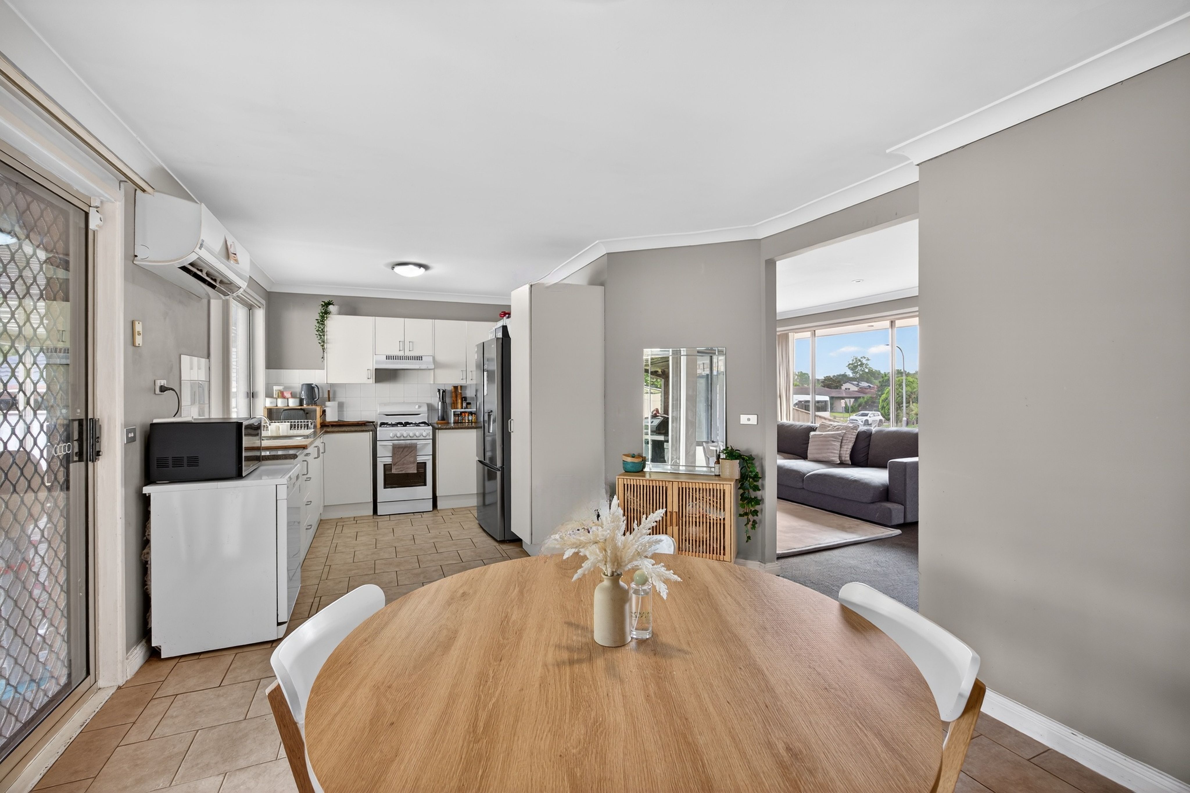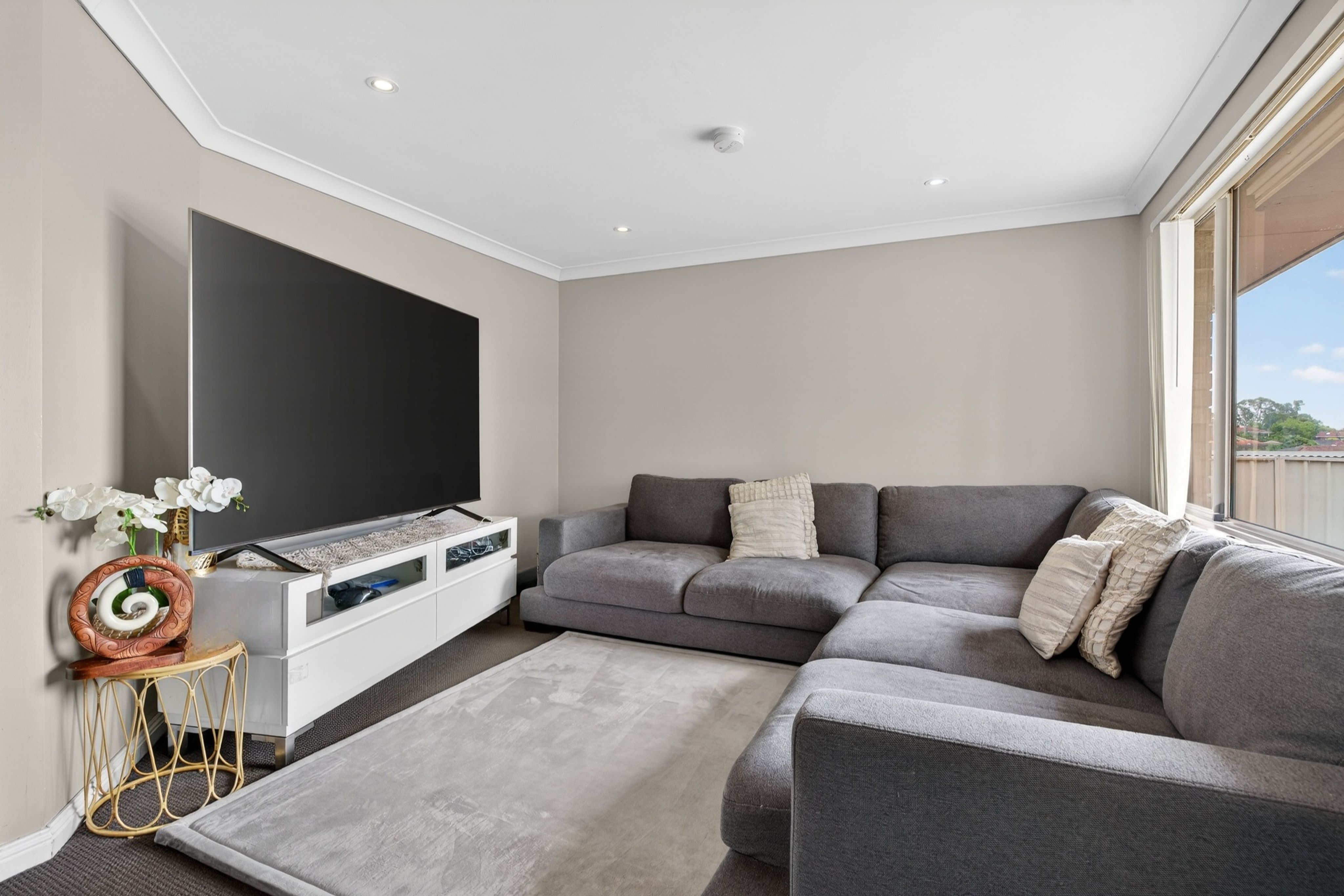 - Bright and comfortable living area featuring, modern downlights, a large window welcoming natural light, and split-system air conditioning for year-round comfort.