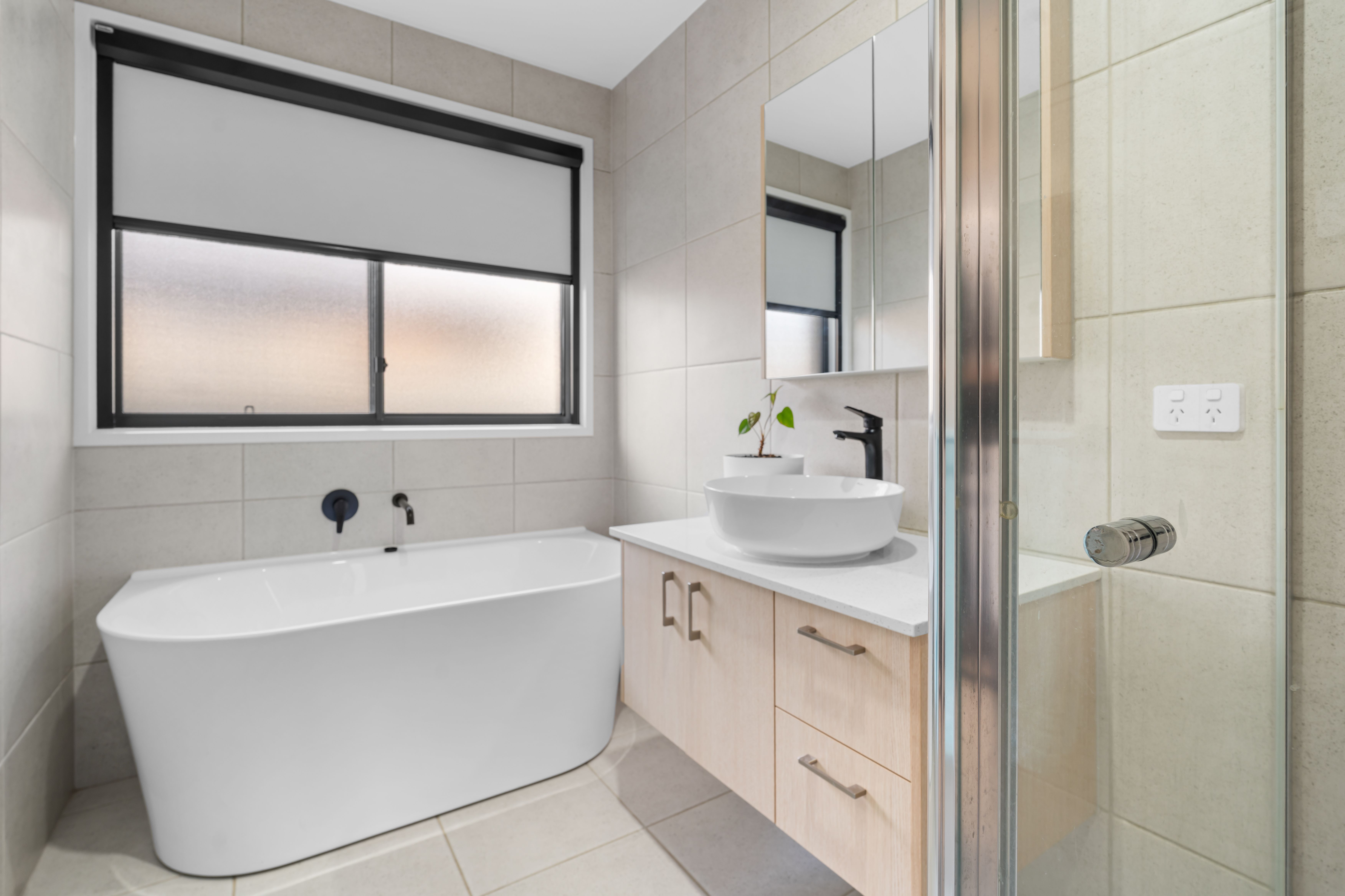 - Two stylish bathrooms featuring floor to ceiling tiles, main bathroom tiled floor to ceiling with premium fittings and 3-way lighting