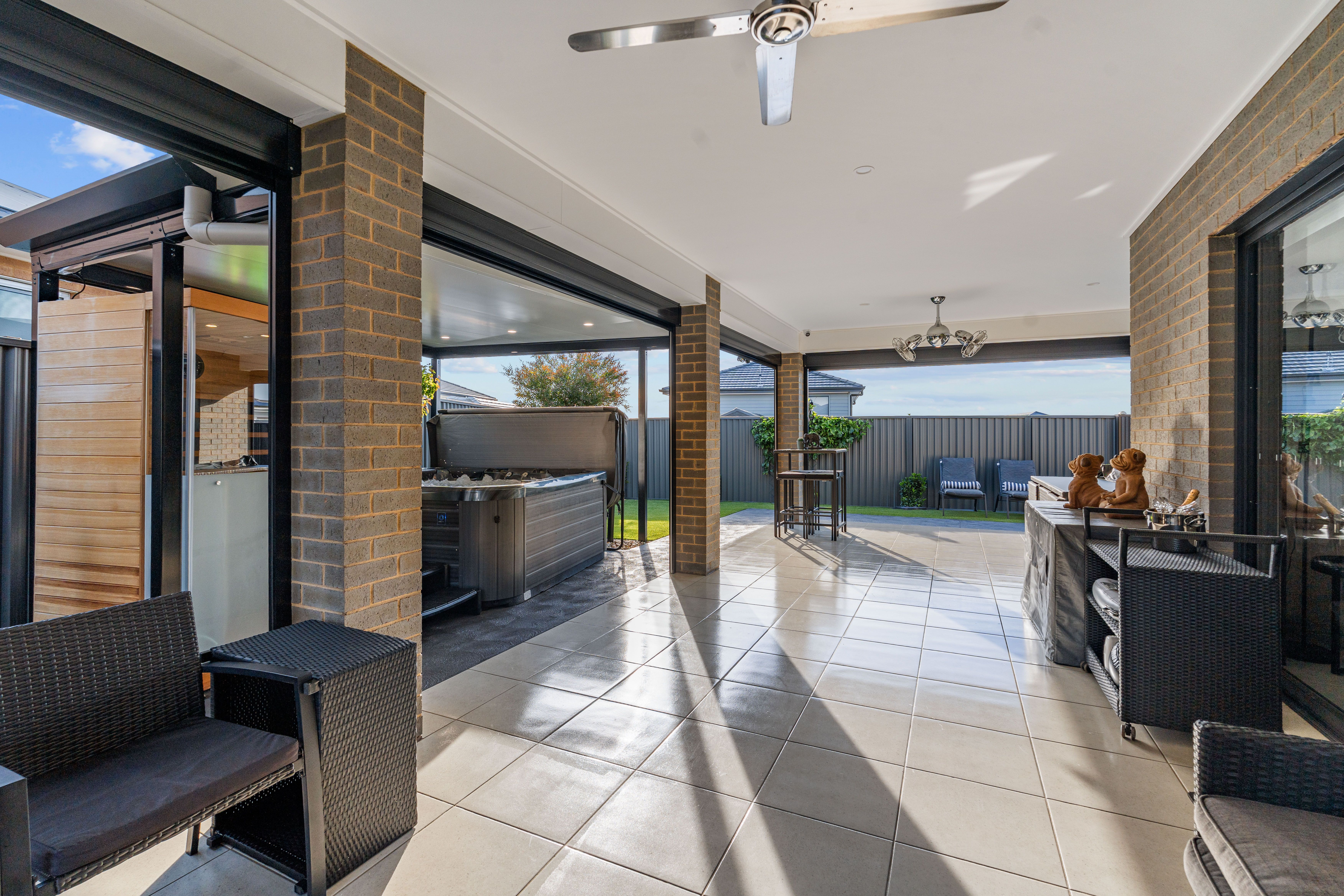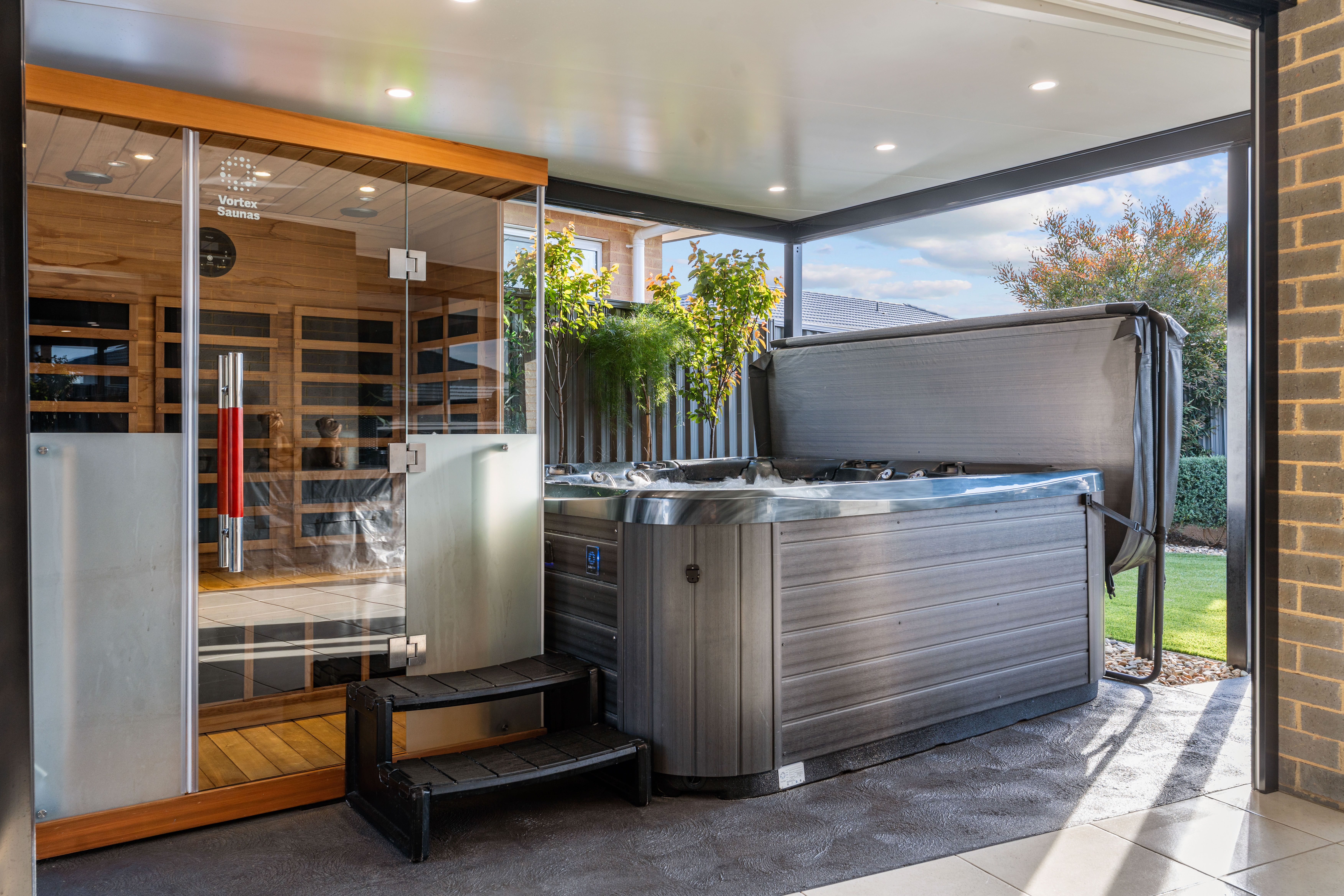 - Undercover entertaining area showcasing 14,000cc spa, electric café blinds, ceiling fans and sauna
