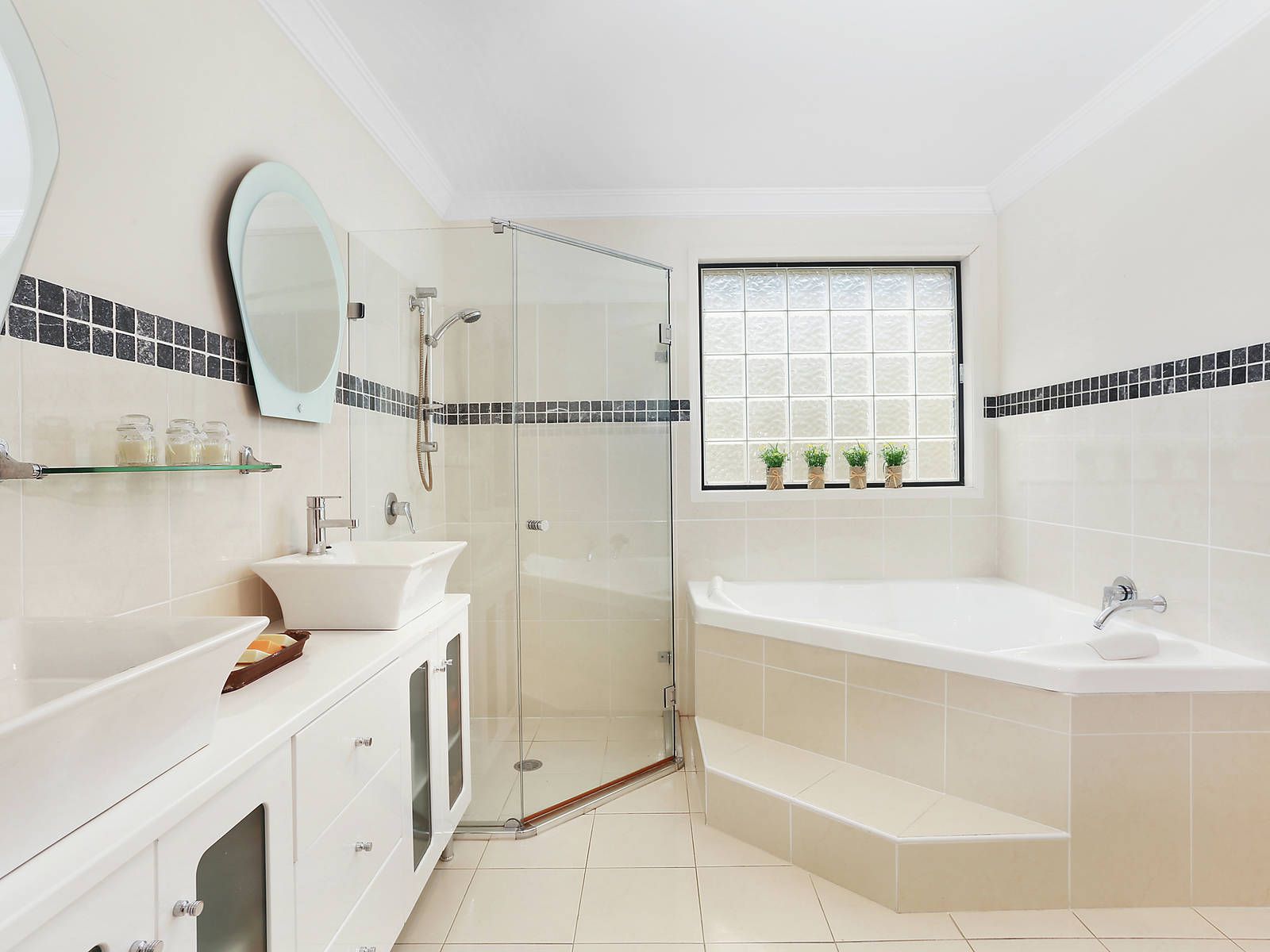 - Main bathroom with double basin, storage and separate toilet