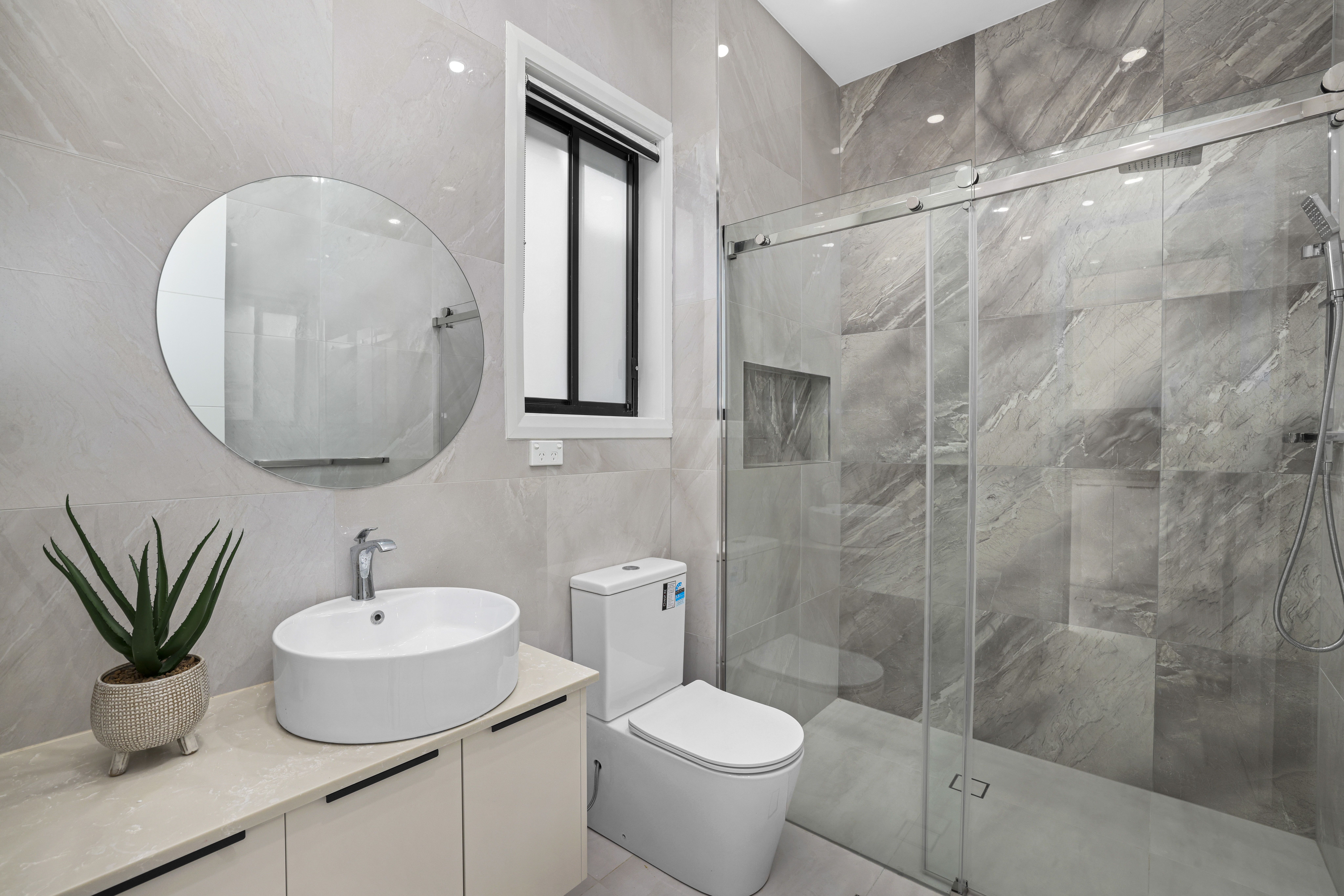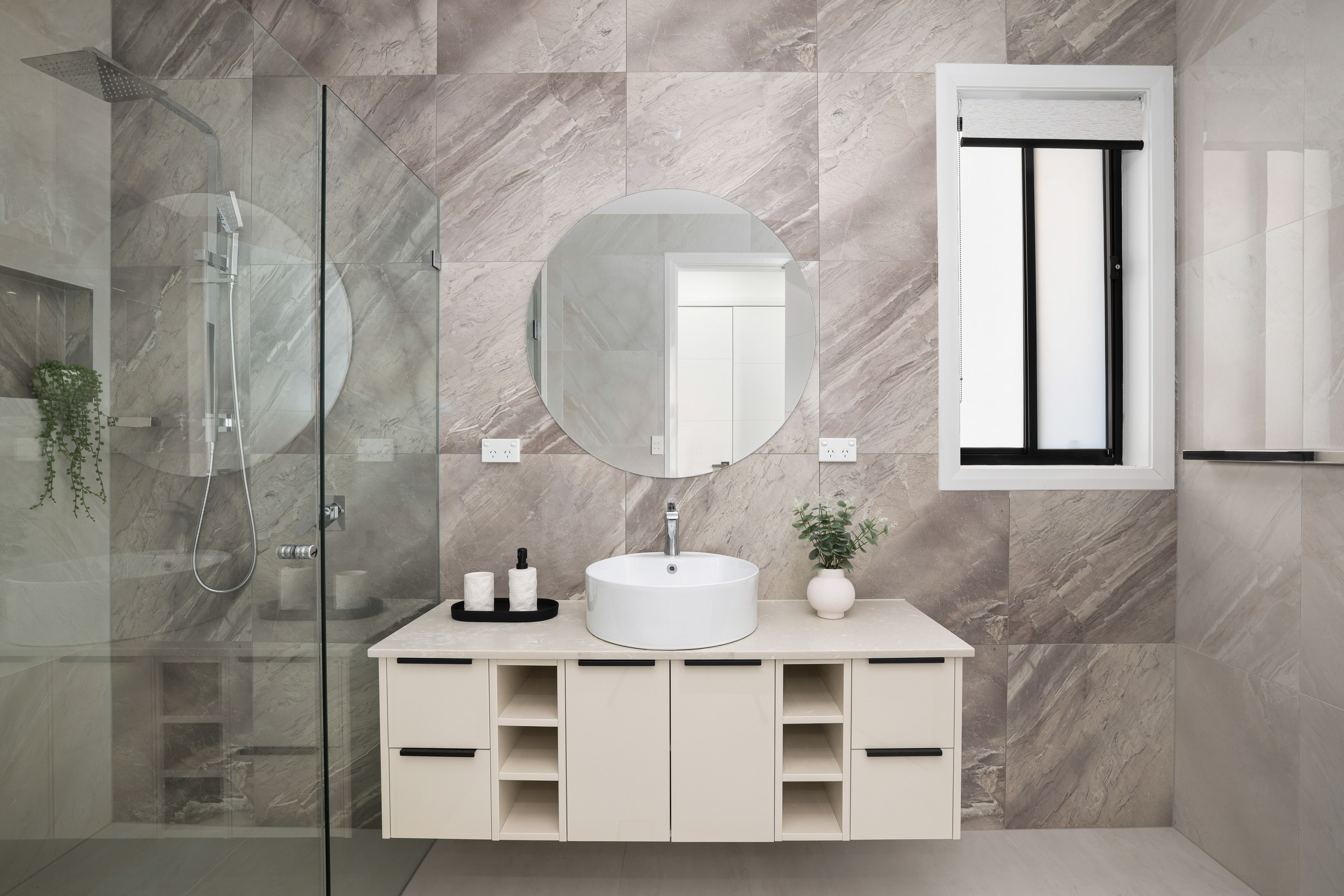 - Downstairs bathroom with floor to ceiling tiling, laundry and linen cupboard