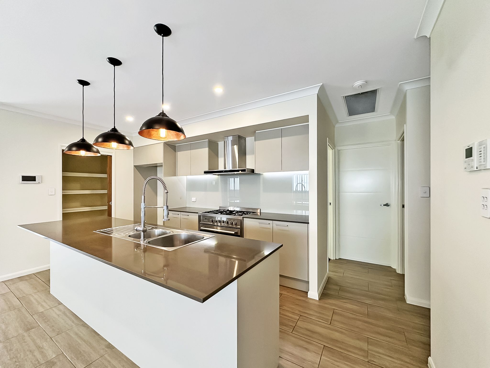 - The kitchen forms the heart of the home with stone bench tops, walk in pantry and feature lighting