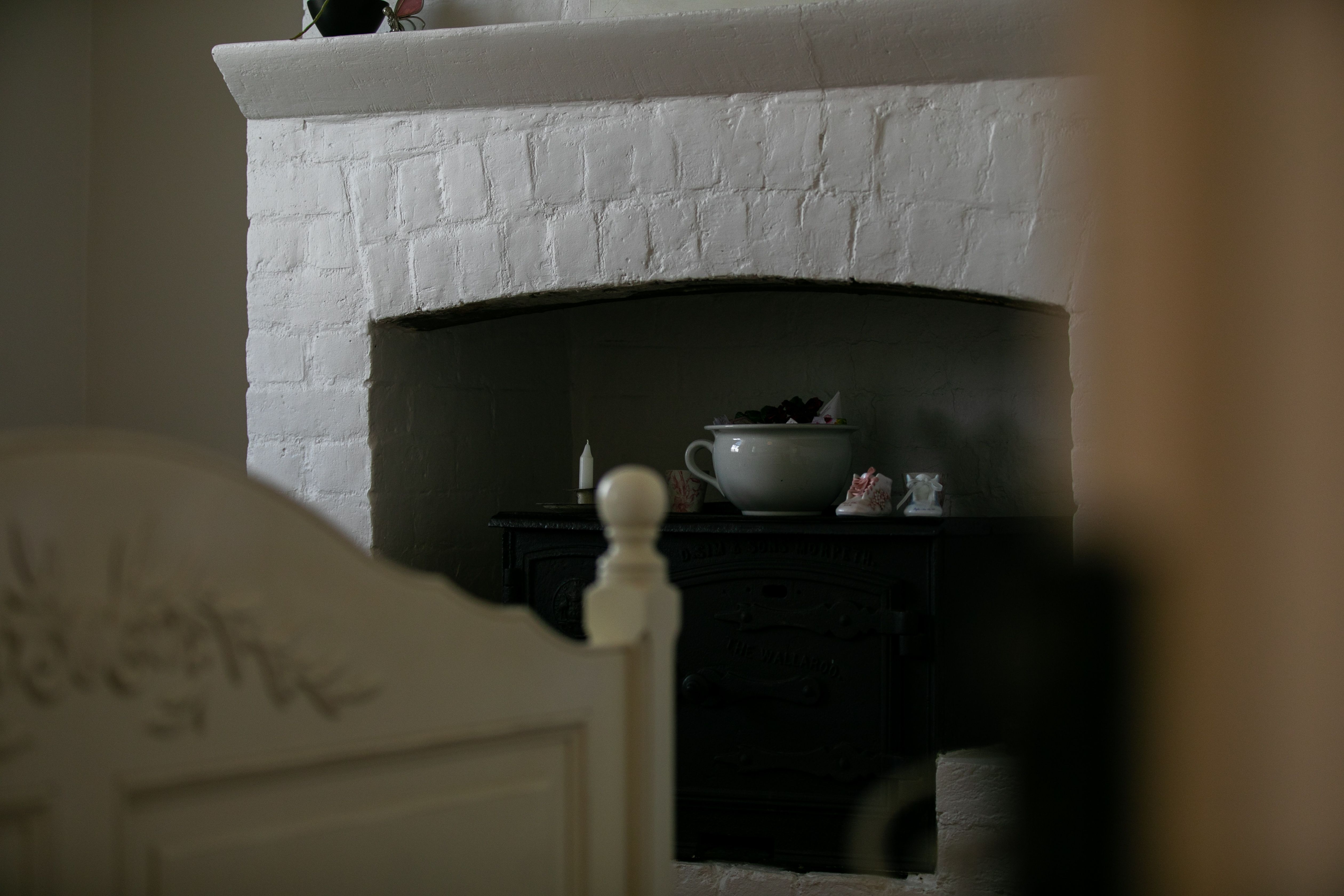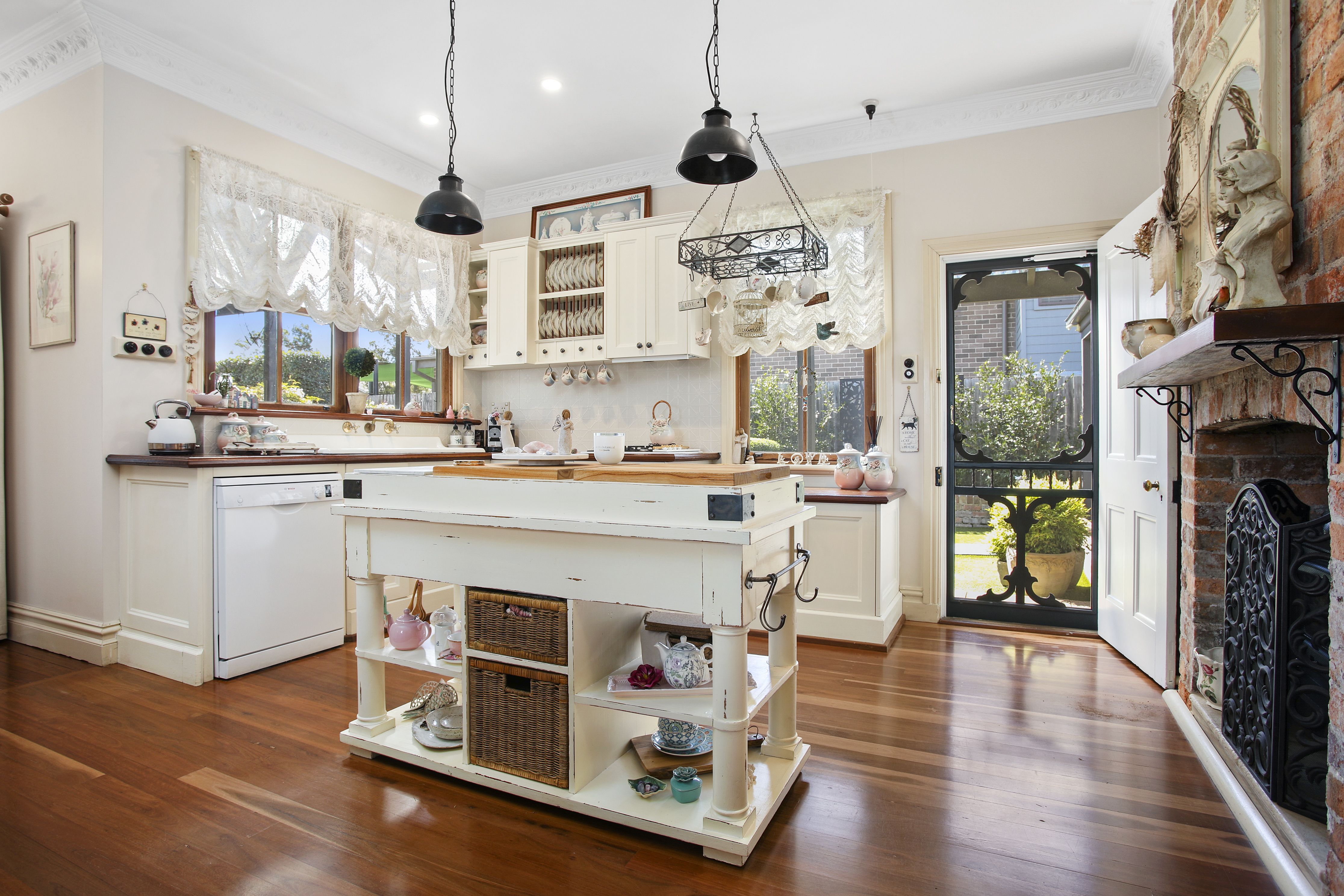 - Country cottage style solid timber kitchen with original ceramic sink, quality appliances, glossy finish hardwood timber benchtops, generous walk-in pantry and original exposed brick fireplace