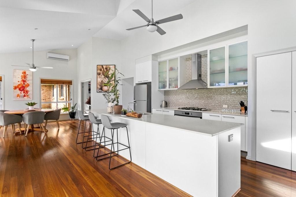 The main living / dining areas are open plan and lead off the impressive kitchen, which has stone benchtops, gas cooking, dishwasher, huge walk-in pantry and island bench top.