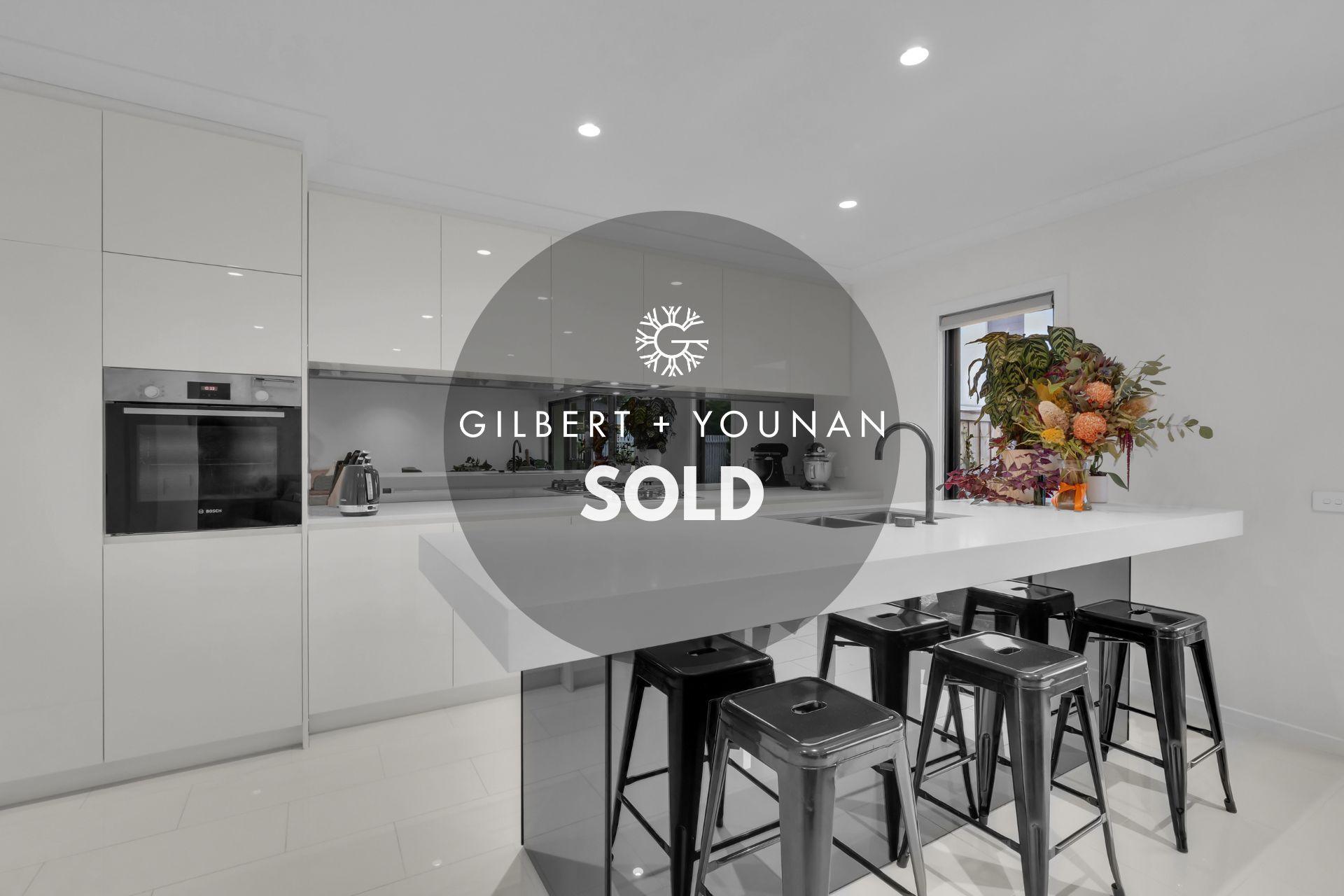 - Sleek kitchen with stone benchtops including reconstituted stone island bench, high gloss cabinetry, pantry and mirror splashback