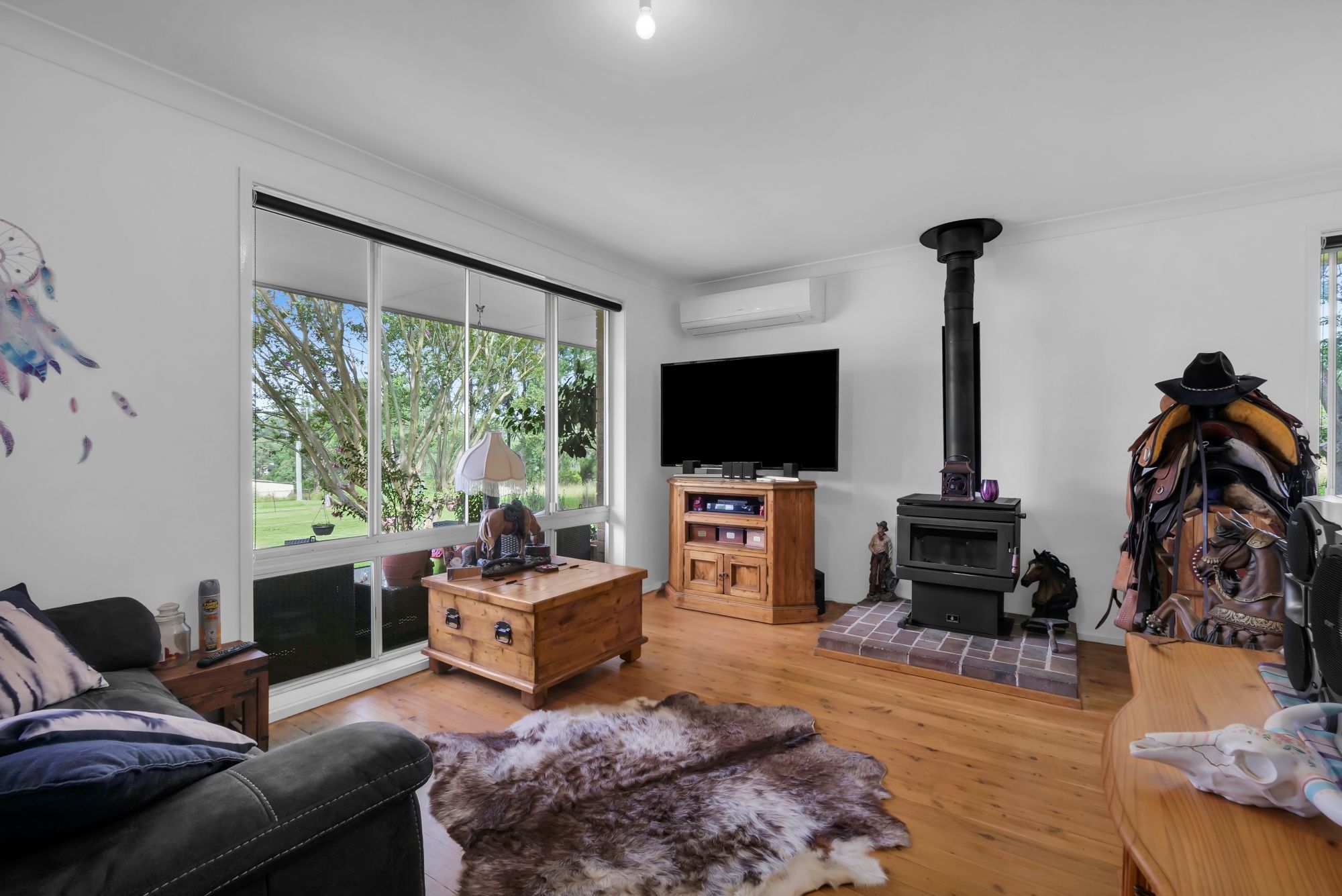 - Open plan living and dining area with a beautiful fireplace and air conditioning