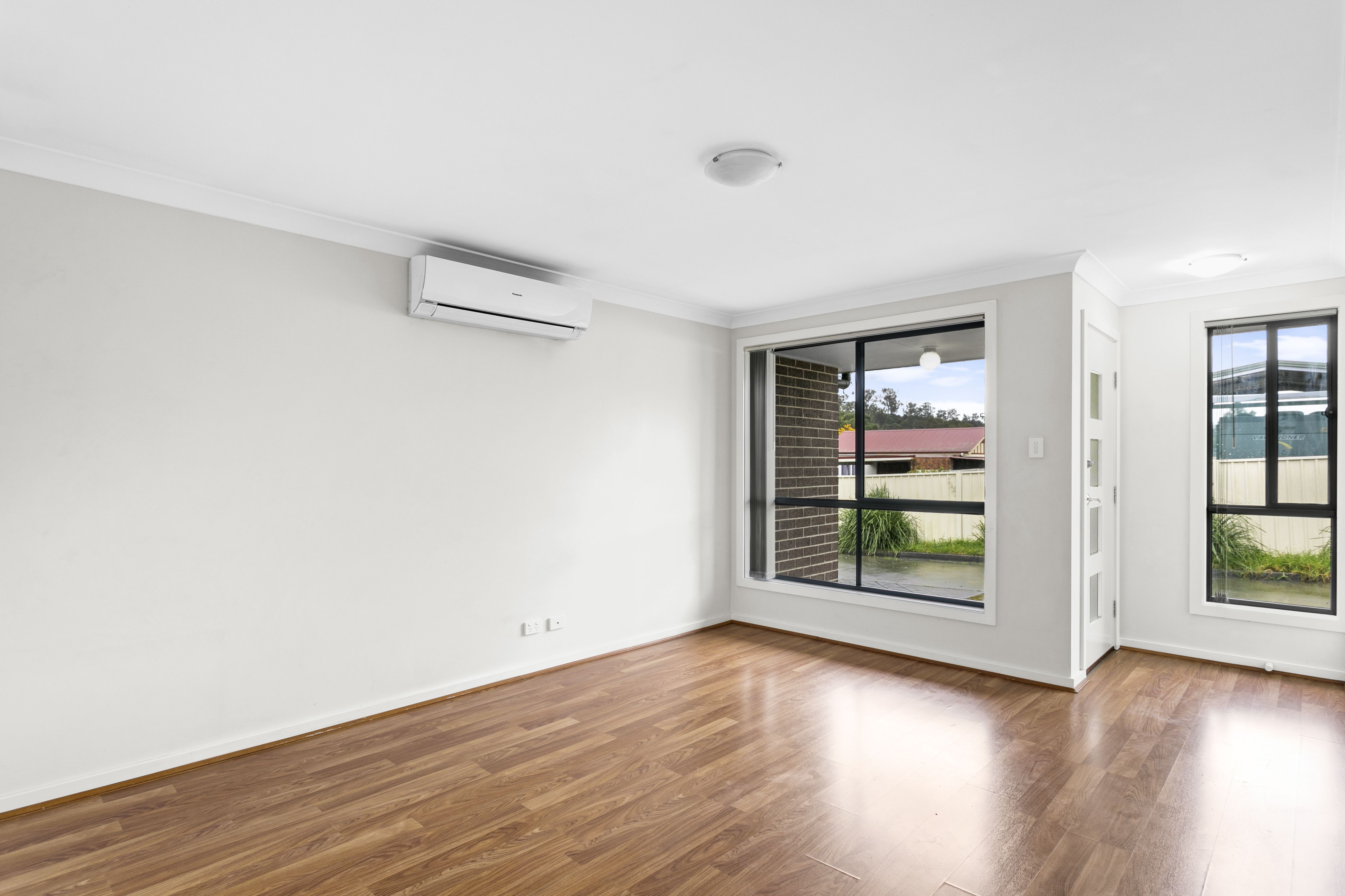 Separate lounge room with split system air conditioning, floating timber floorboards continuing through to kitchen/meals area.