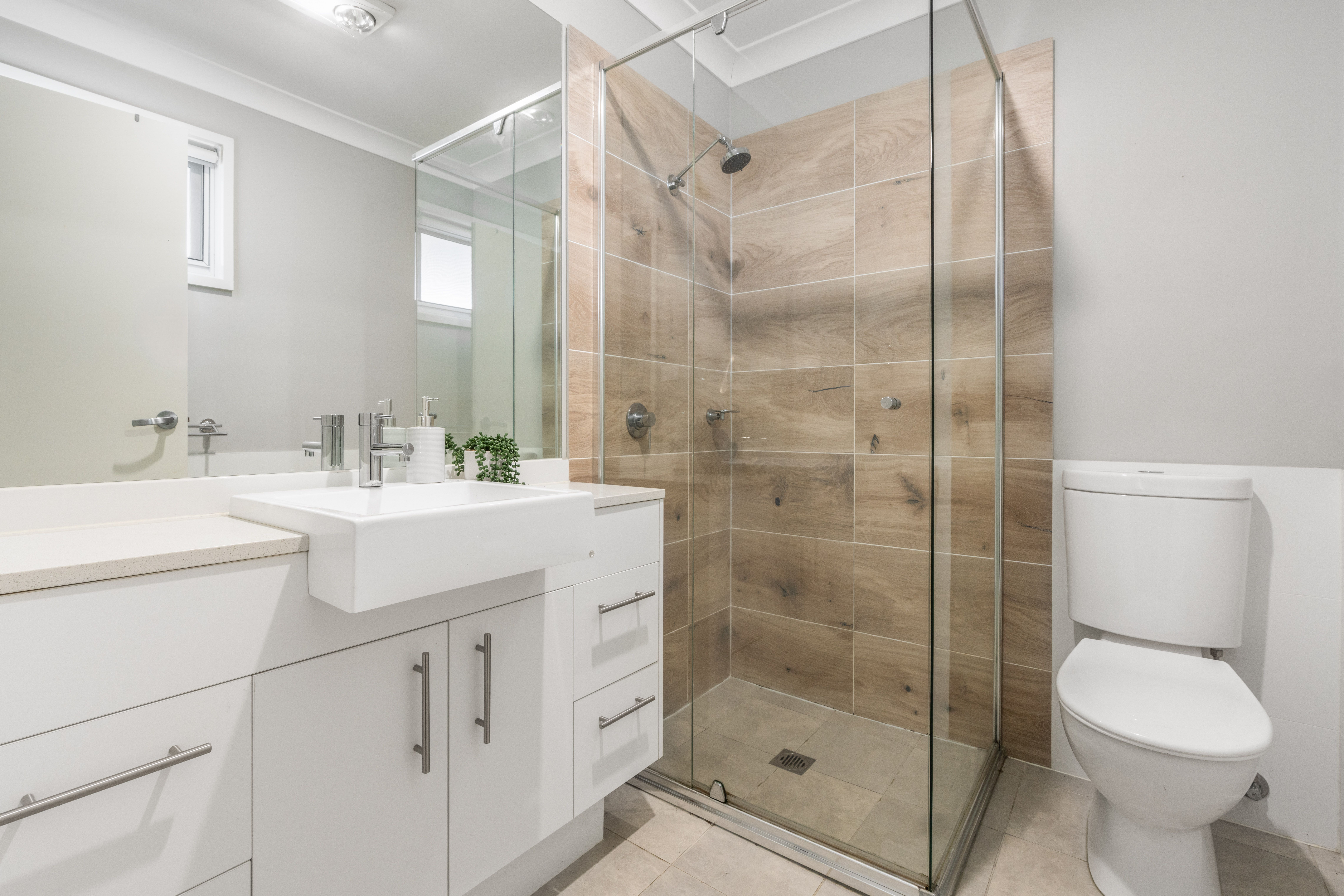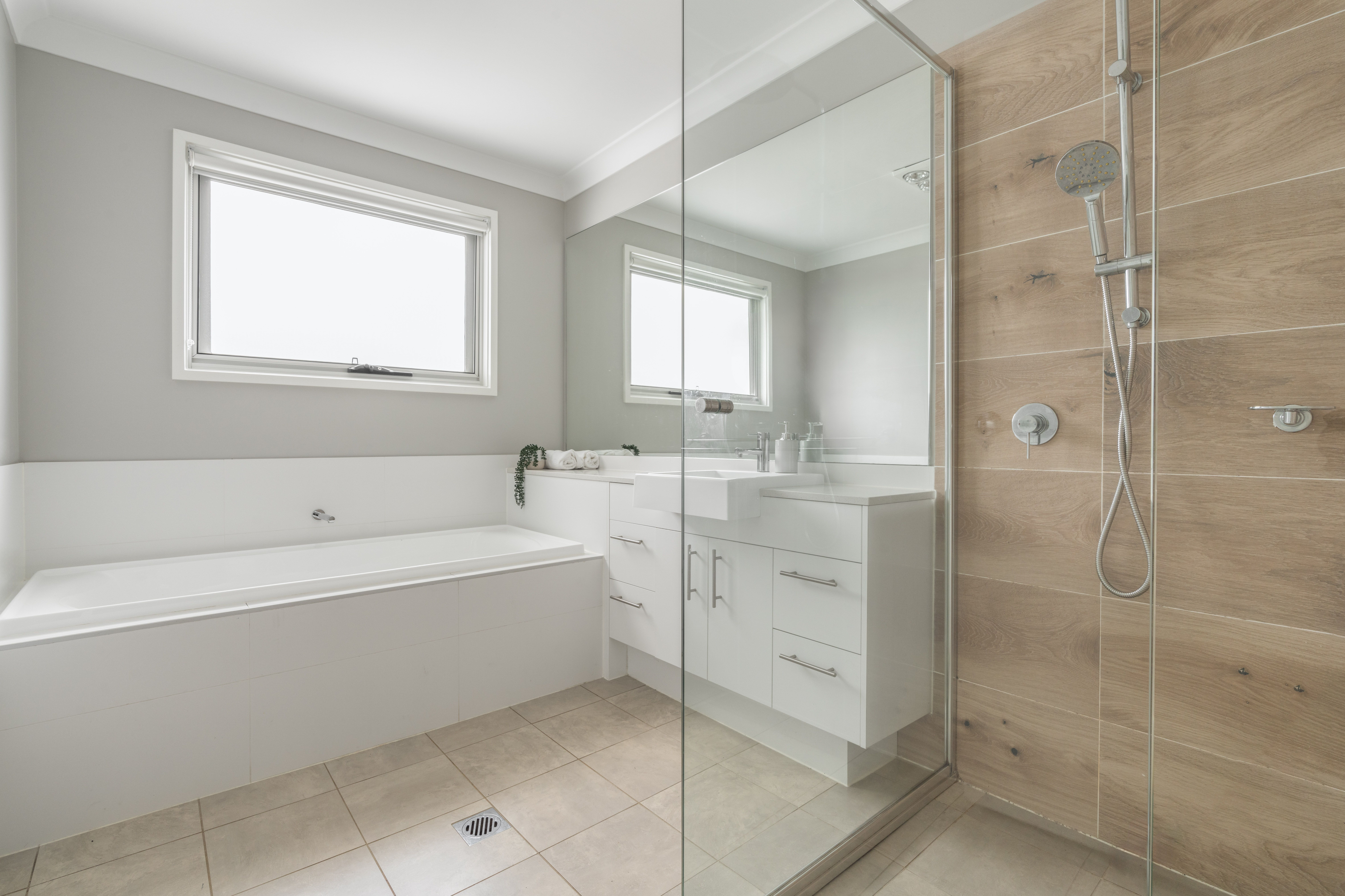 - The main bathroom includes a bathtub, large shower with feature tiles, and a built-in vanity, with a separate powder room.