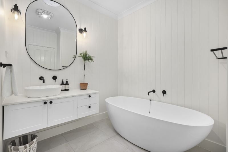 - Contemporary newly renovated main bathroom with free standing bath, shower niche plus separate powder room