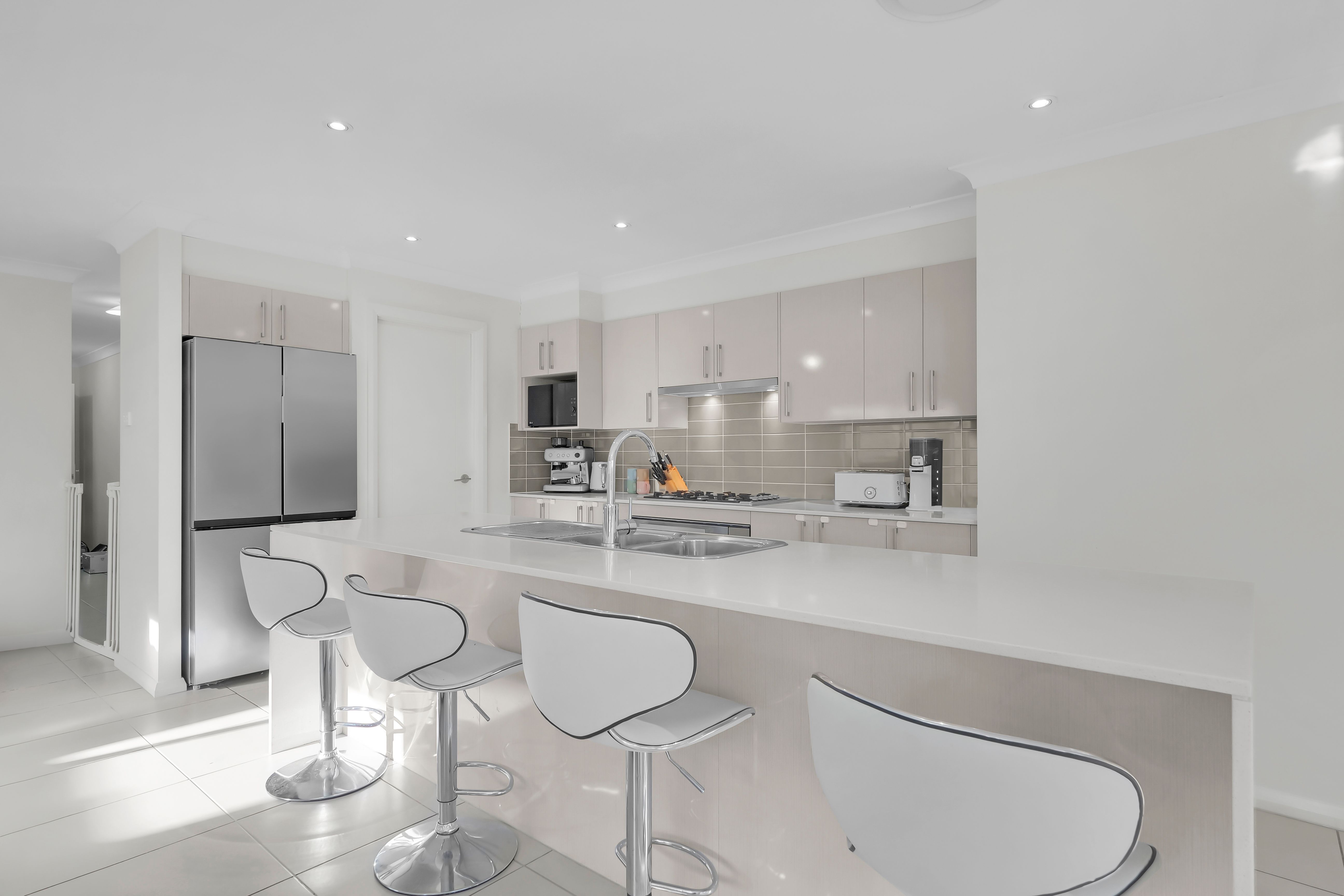 - A sleek and modern kitchen with stone benchtops, stainless steel cooking appliances and walk-in pantry