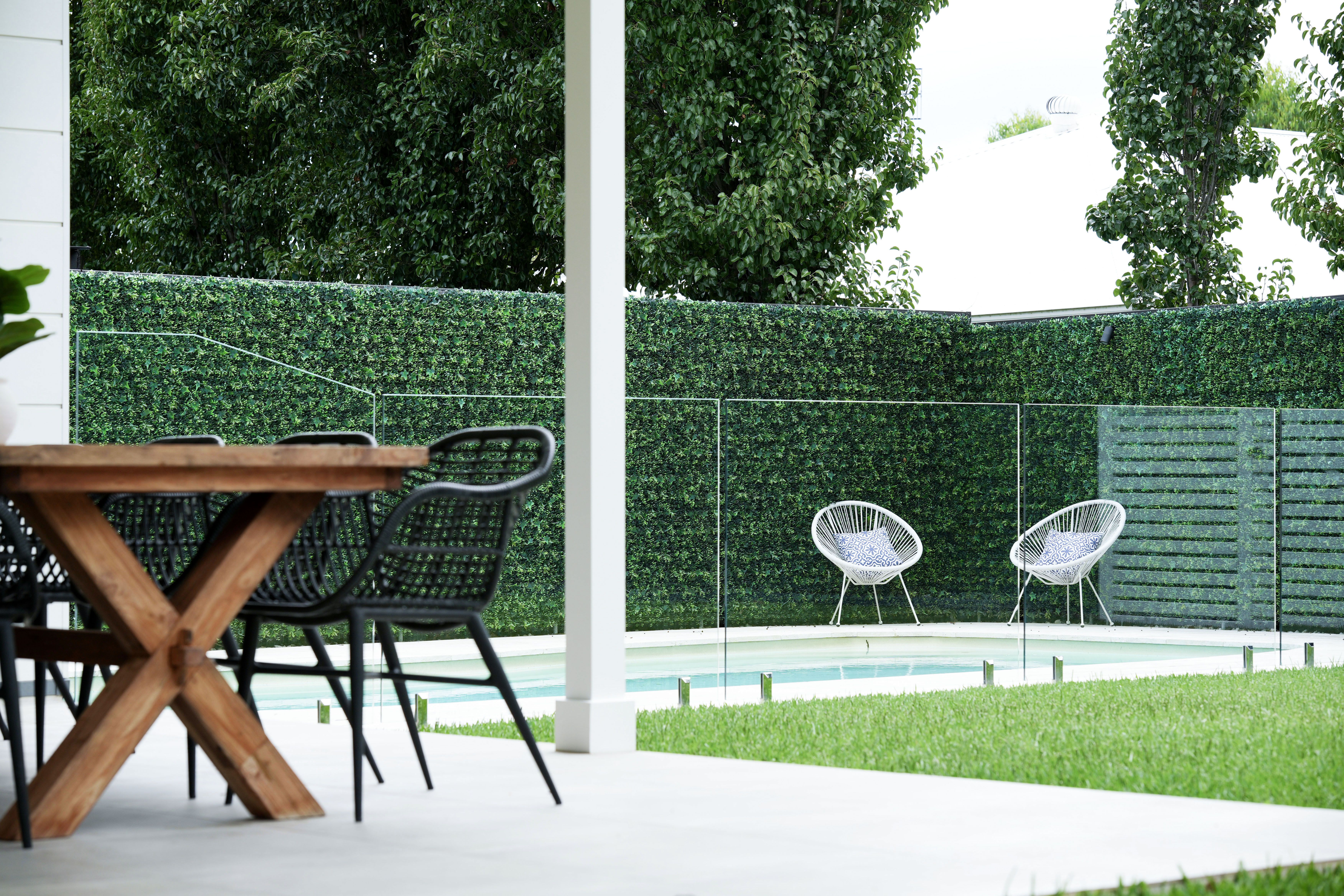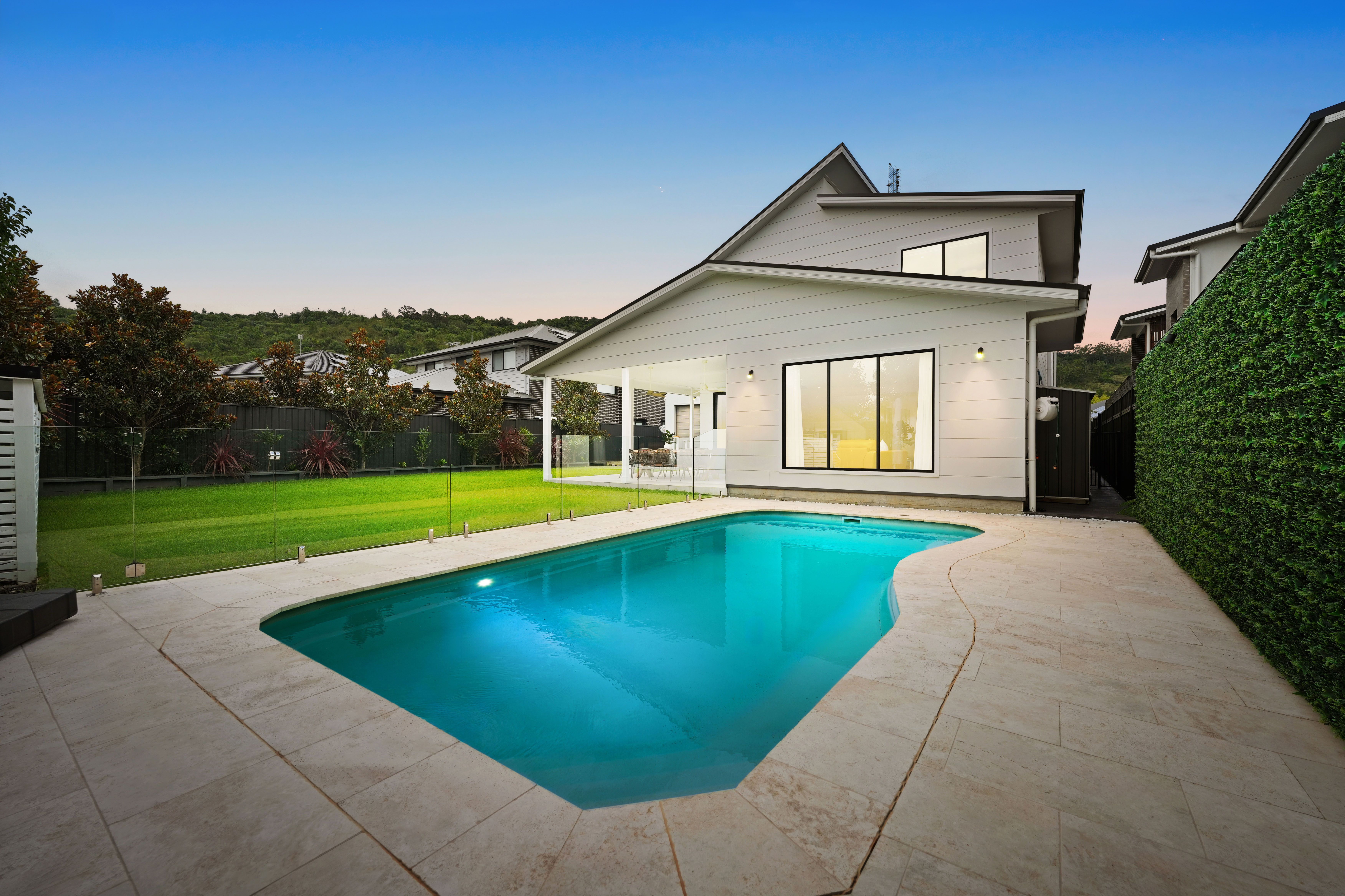 The incredible In-ground heated saltwater swimming pool is equipped with automatic chlorinator surrounded glass fencing and travertine paving.