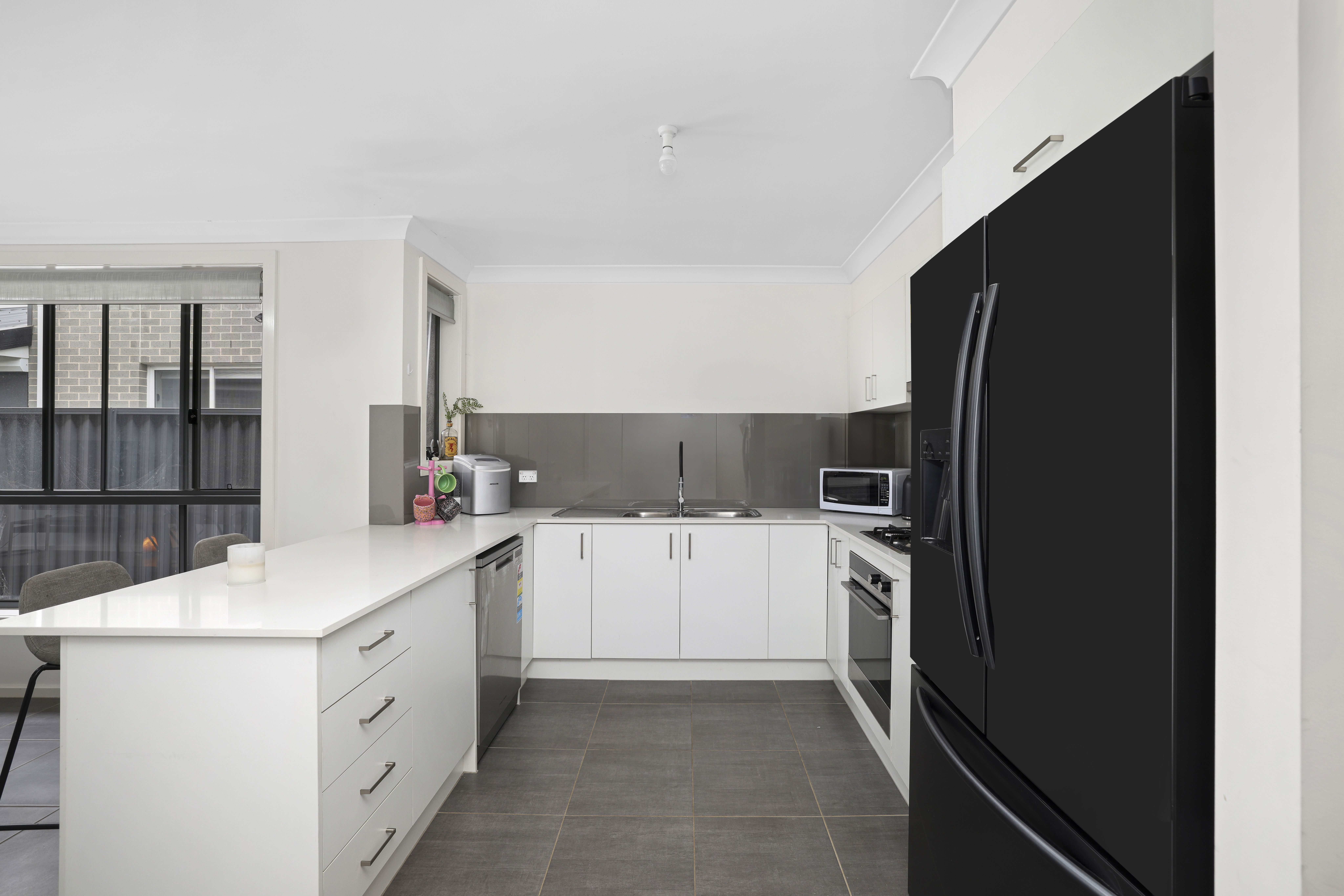 - Modern kitchen with stone benchtops, stainless steel appliances and glass splashback