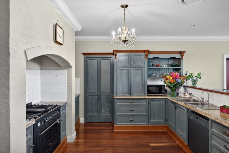 The kitchen is a chef's dream, offering stone benchtops, a 900mm Ilve oven with a feature rangehood, quality timber cabinetry, and a dishwasher. A cleverly designed walk-through pantry connecting the kitchen to the dining space; a statement chandeliers add both style and practicality to the space,