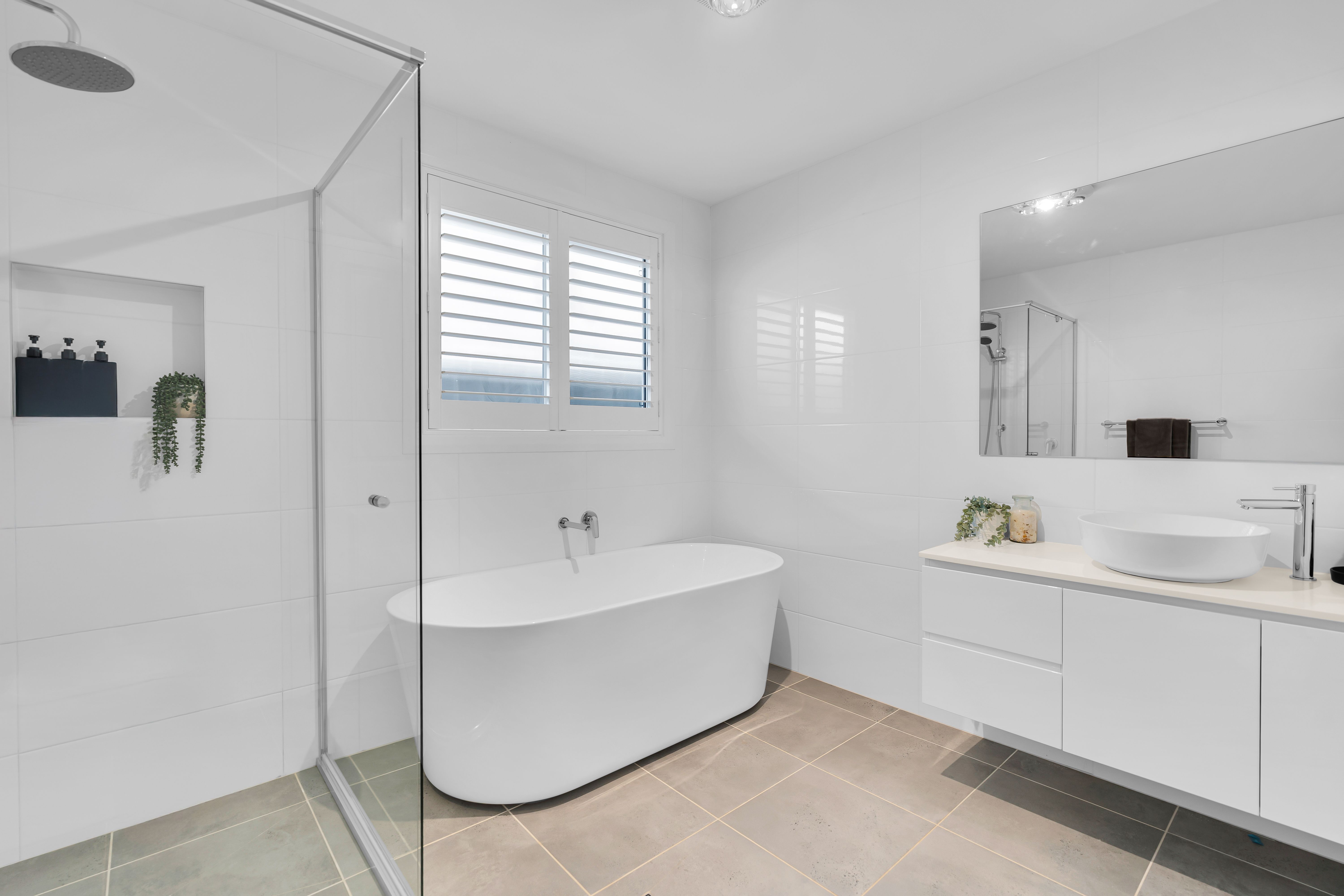 There is a centrally located media room with barn-style door, a beautiful family bathroom with stone bench and freestanding bath