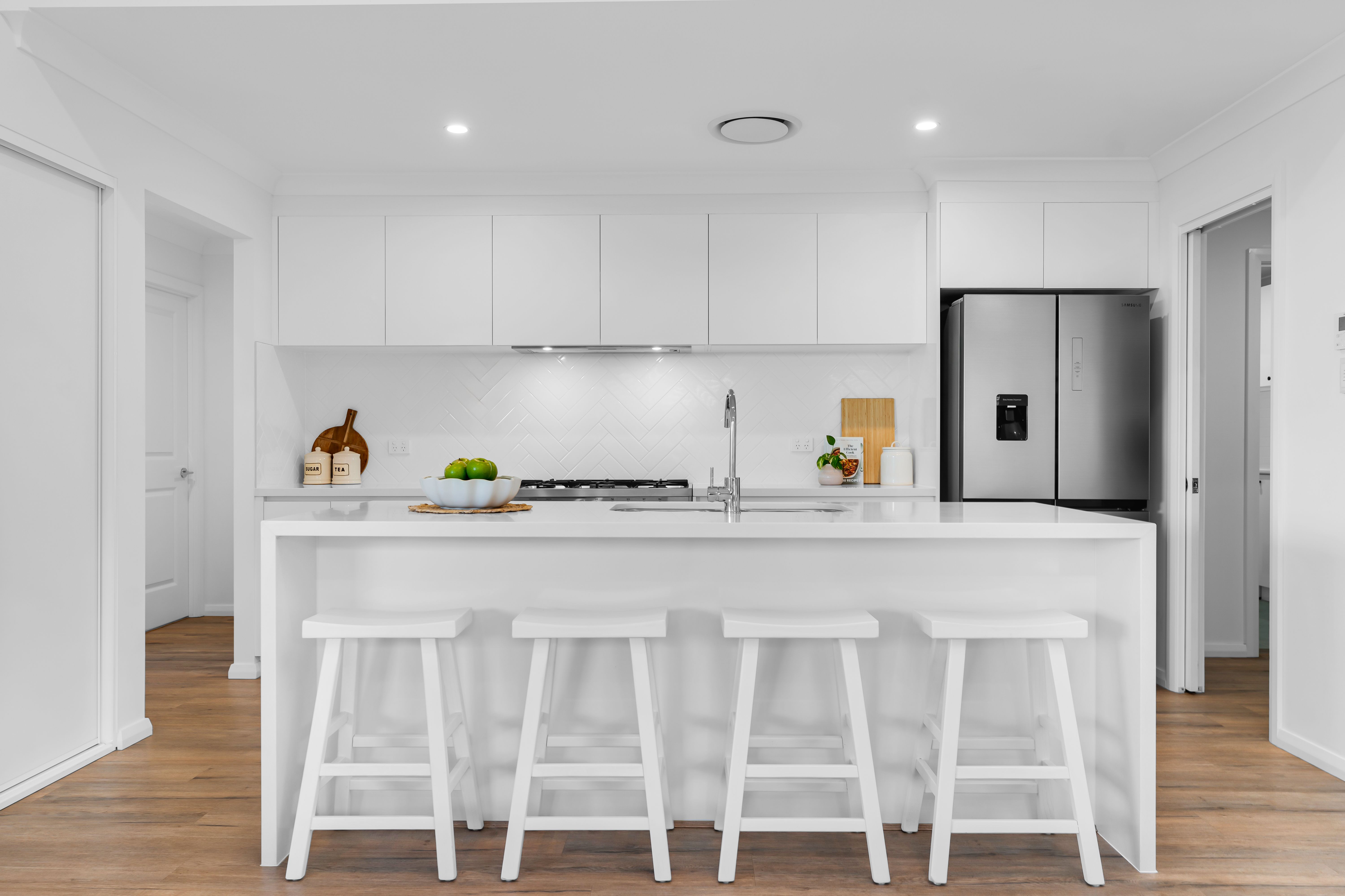 Designed with functionality in mind, the open plan family, dining and kitchen area, which features quality hybrid flooring, flows seamlessly through to undercover alfresco area