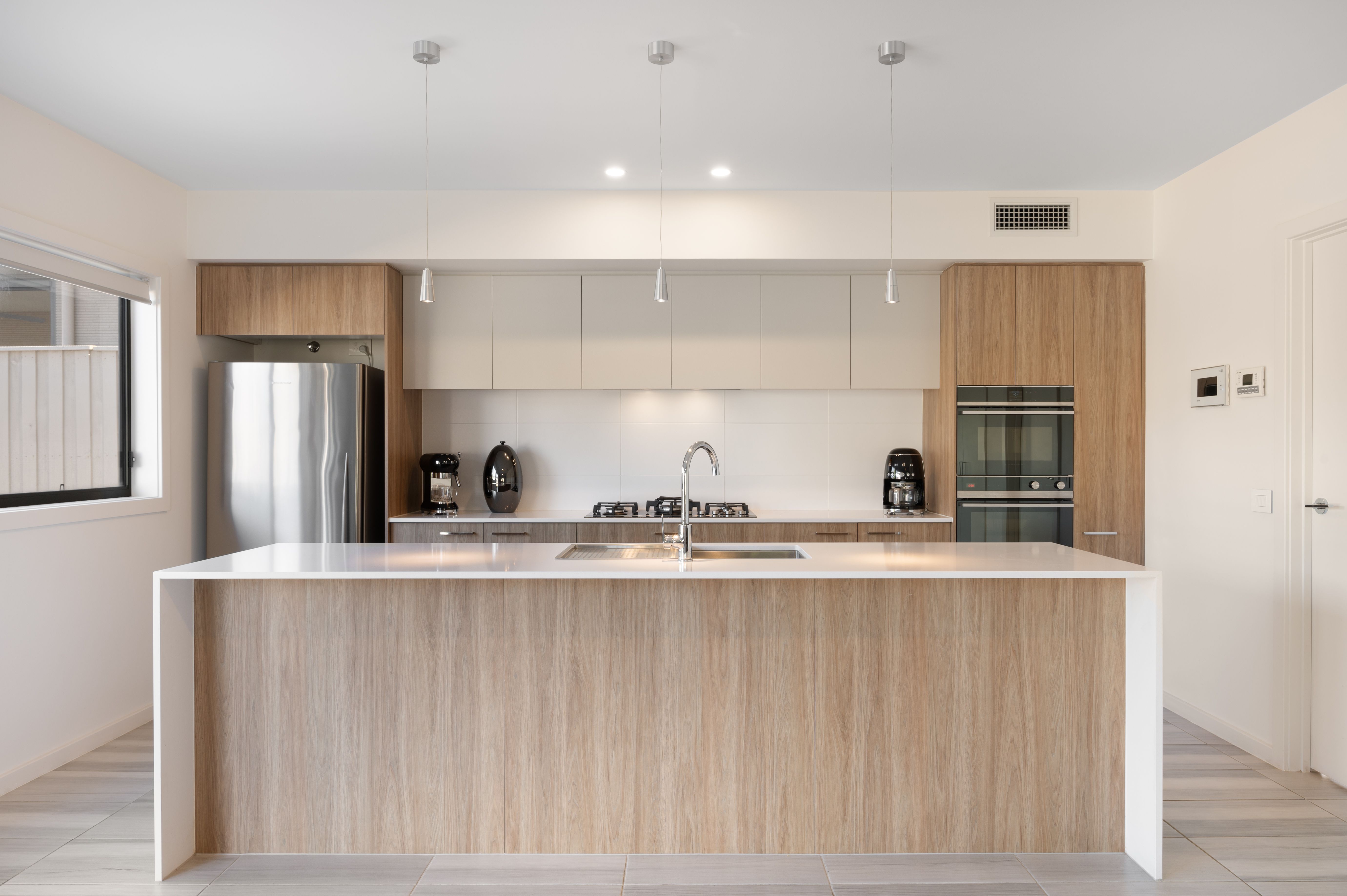 -Sleek modern kitchen featuring stone benchtops, premium appliance and finishes