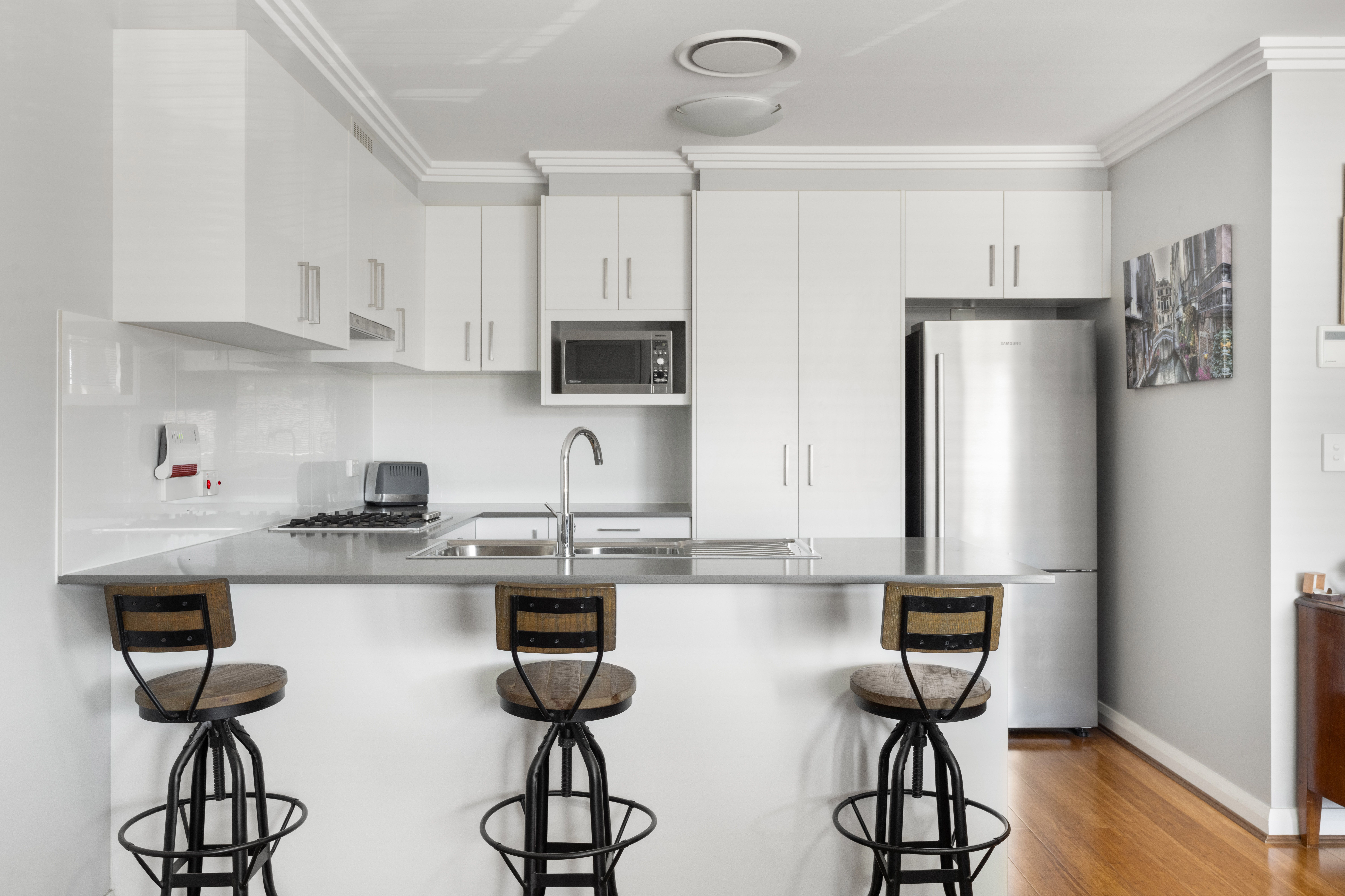 - Modern kitchen with stone benchtops, gas stove, rangehood and ample storage space