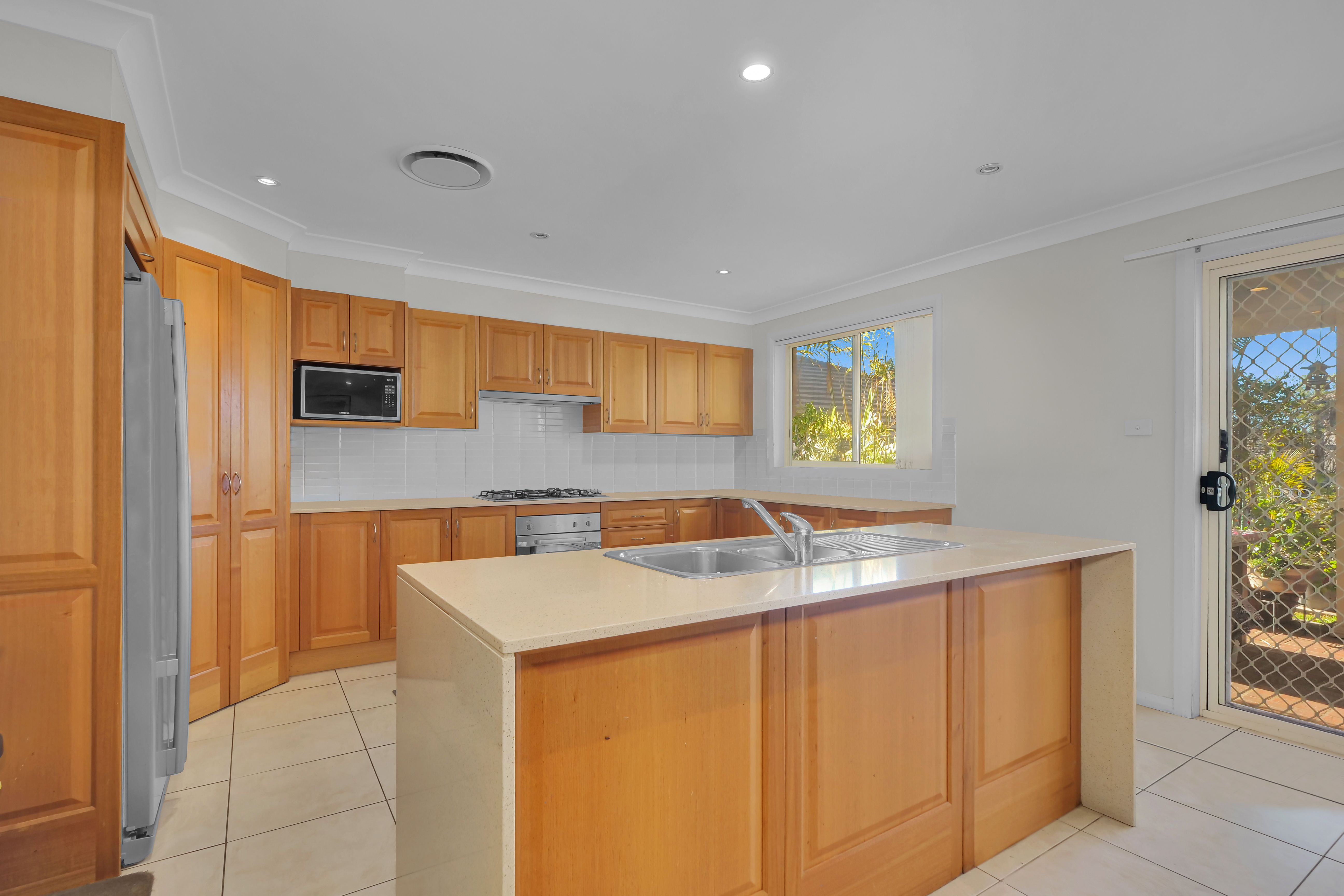 - An open plan timber kitchen with stone benchtops, gas cooking and pantry with an abundance of storage space