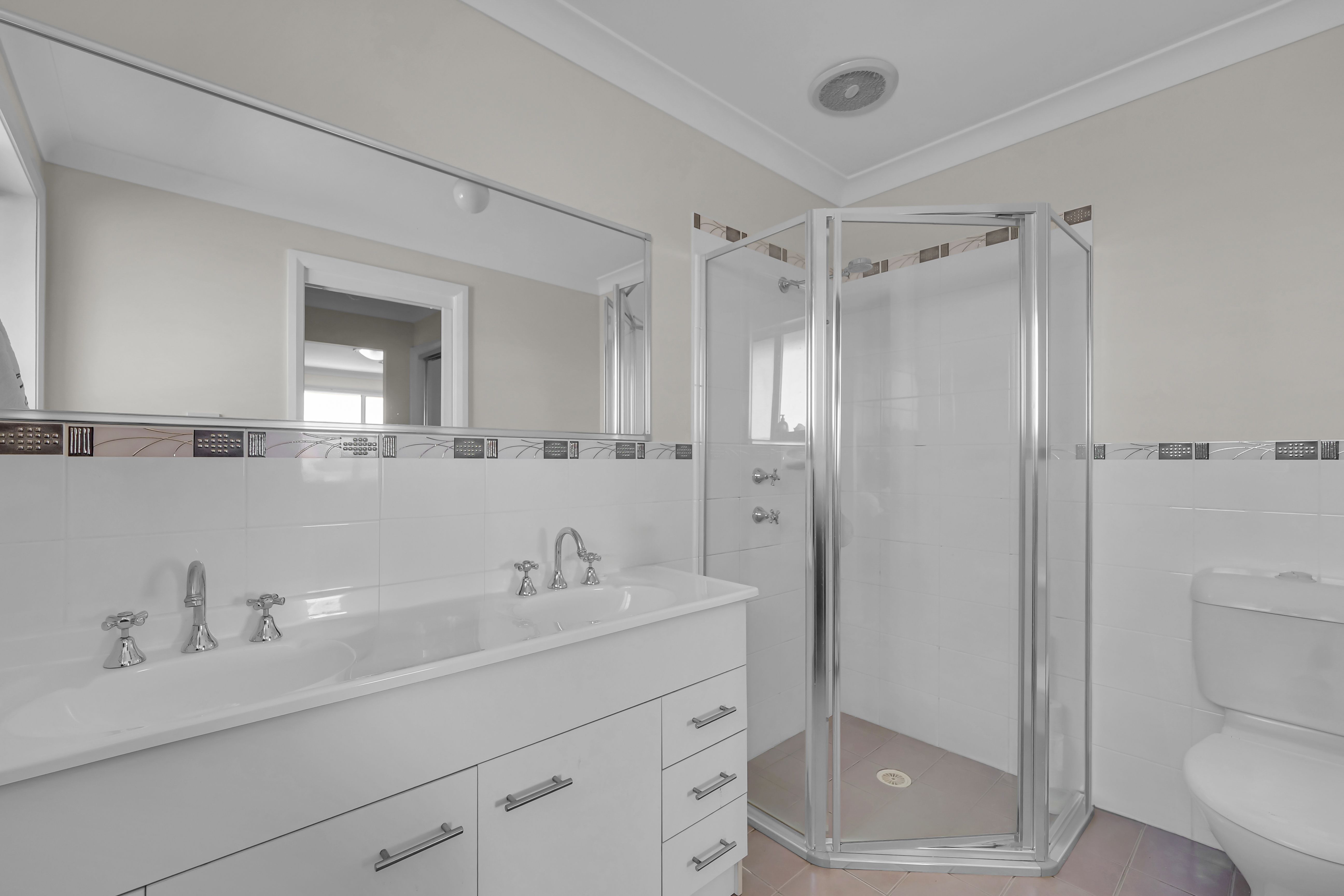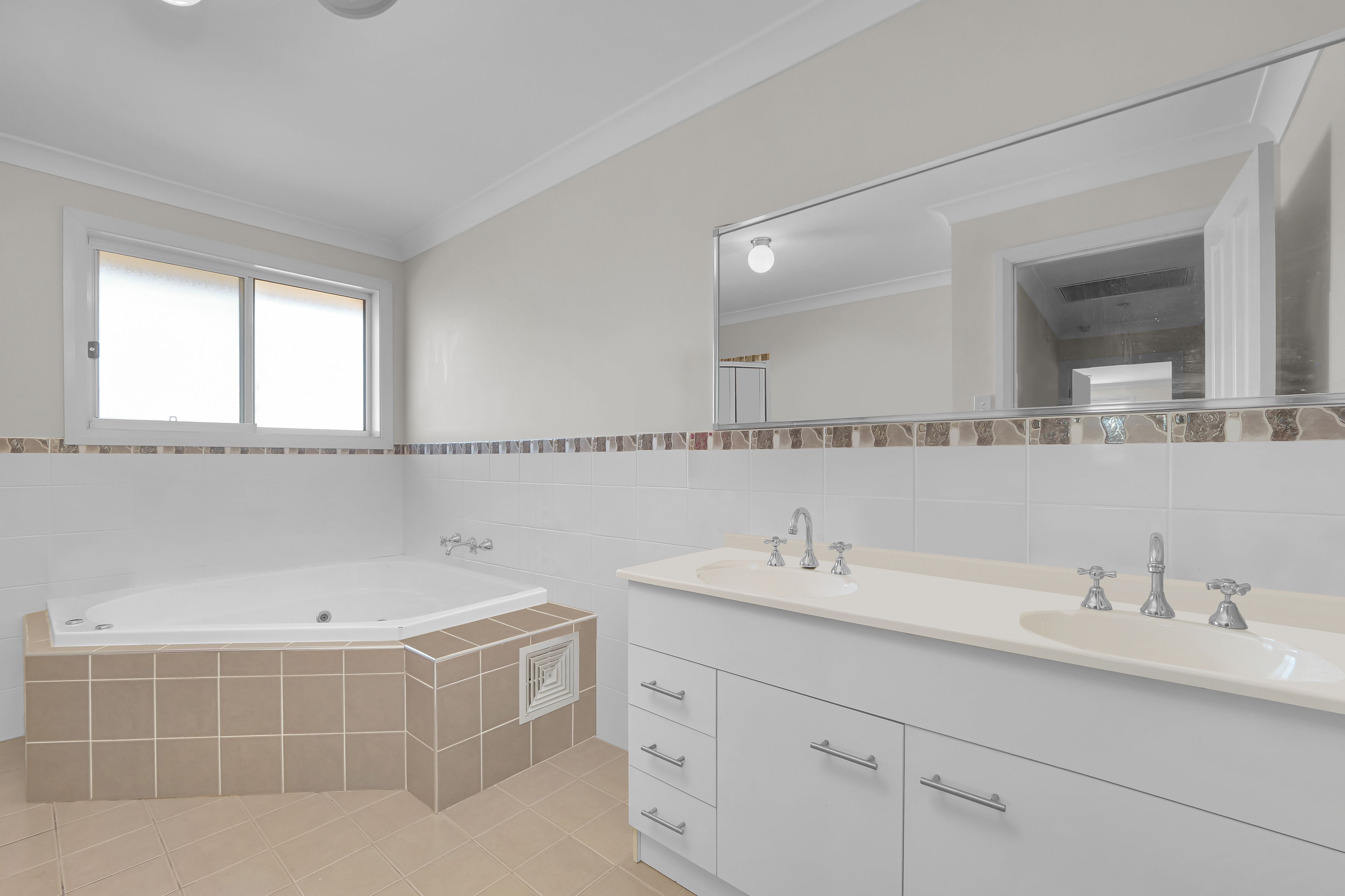 - Centrally located family bathroom with corner spa bath and double vanity