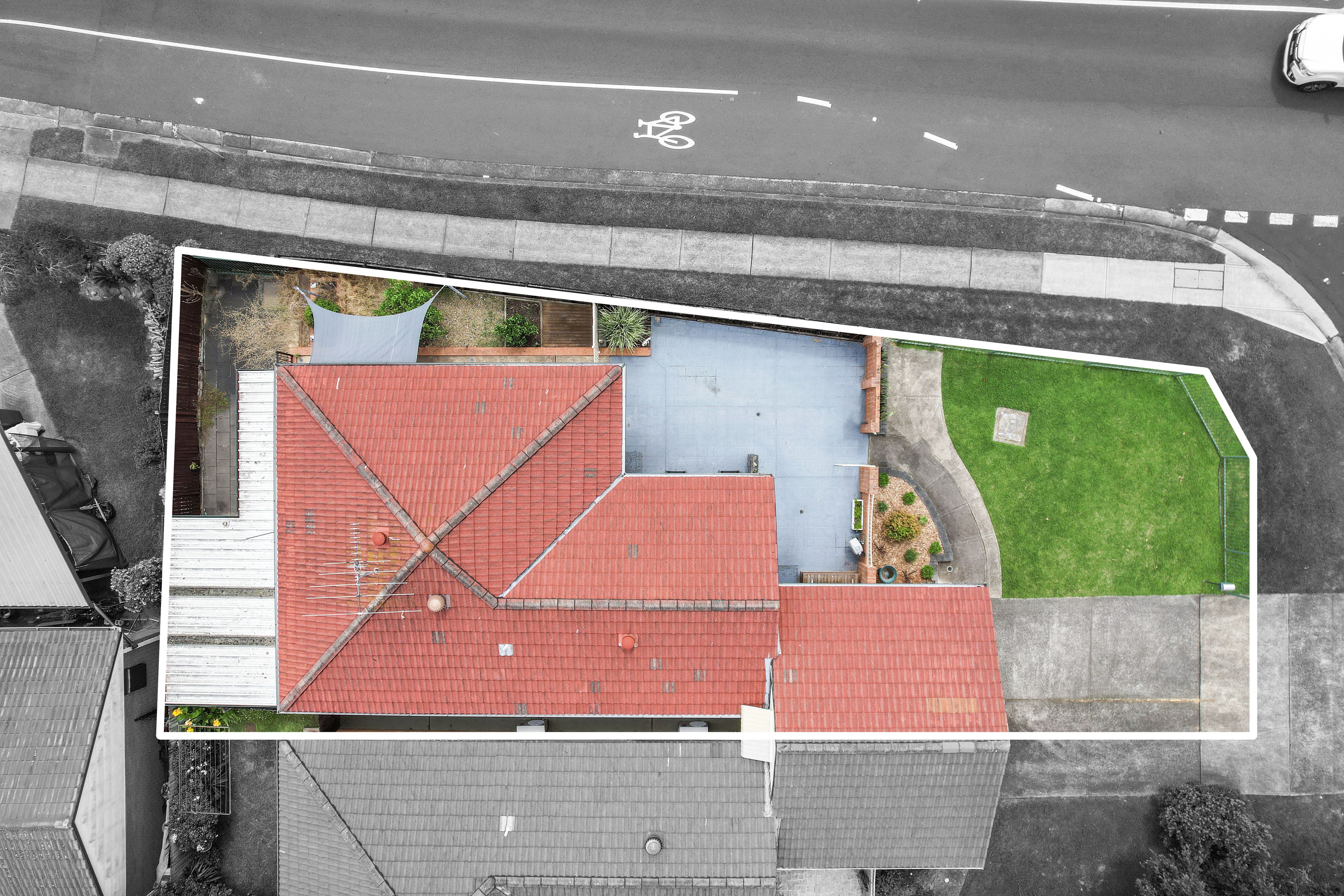 - Tiled front porch, single garage under main roof