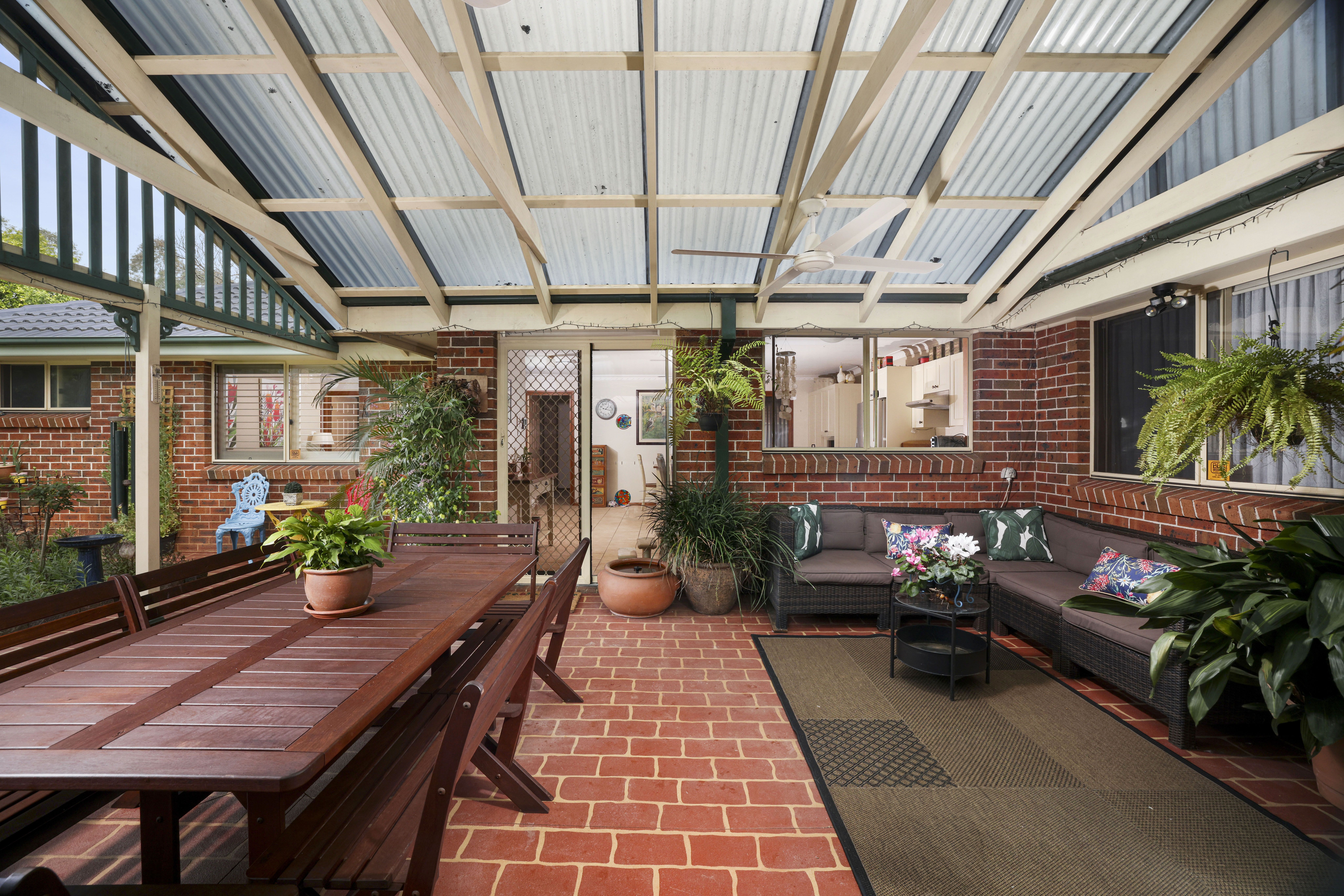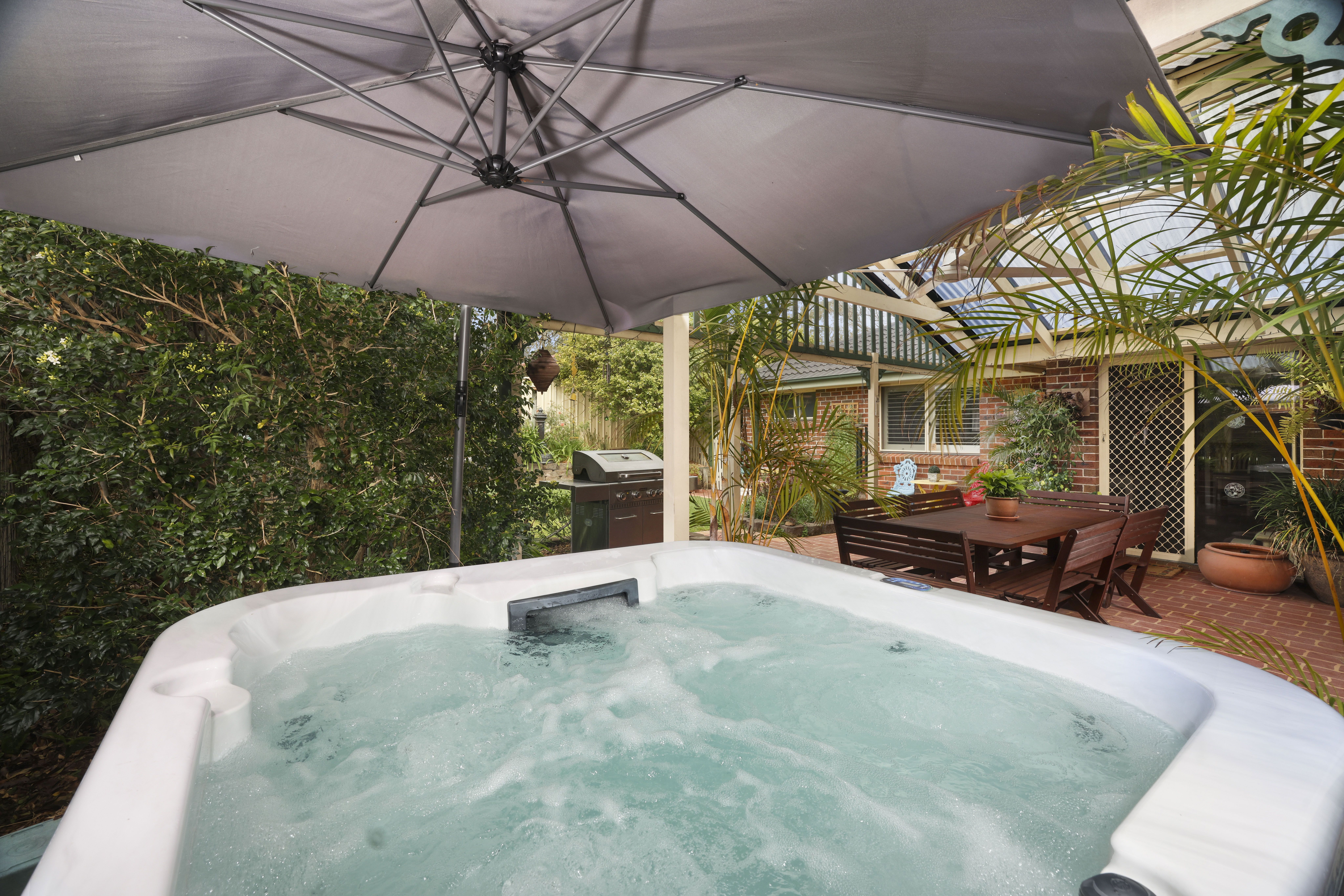 - An expansive covered outdoor entertaining area with a heated spa