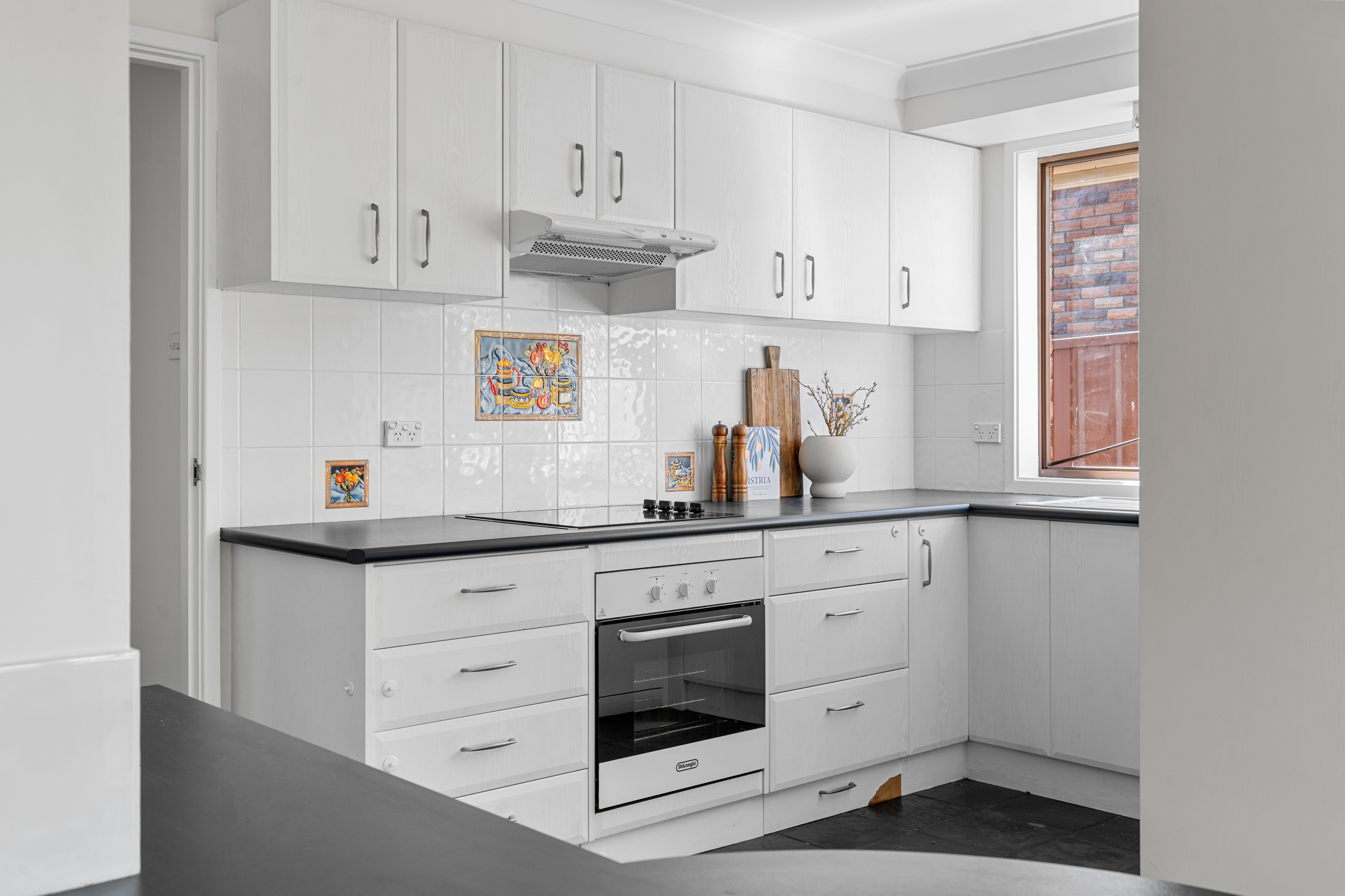 - Bright, sun-drenched kitchen featuring ample storage and a rangehood
