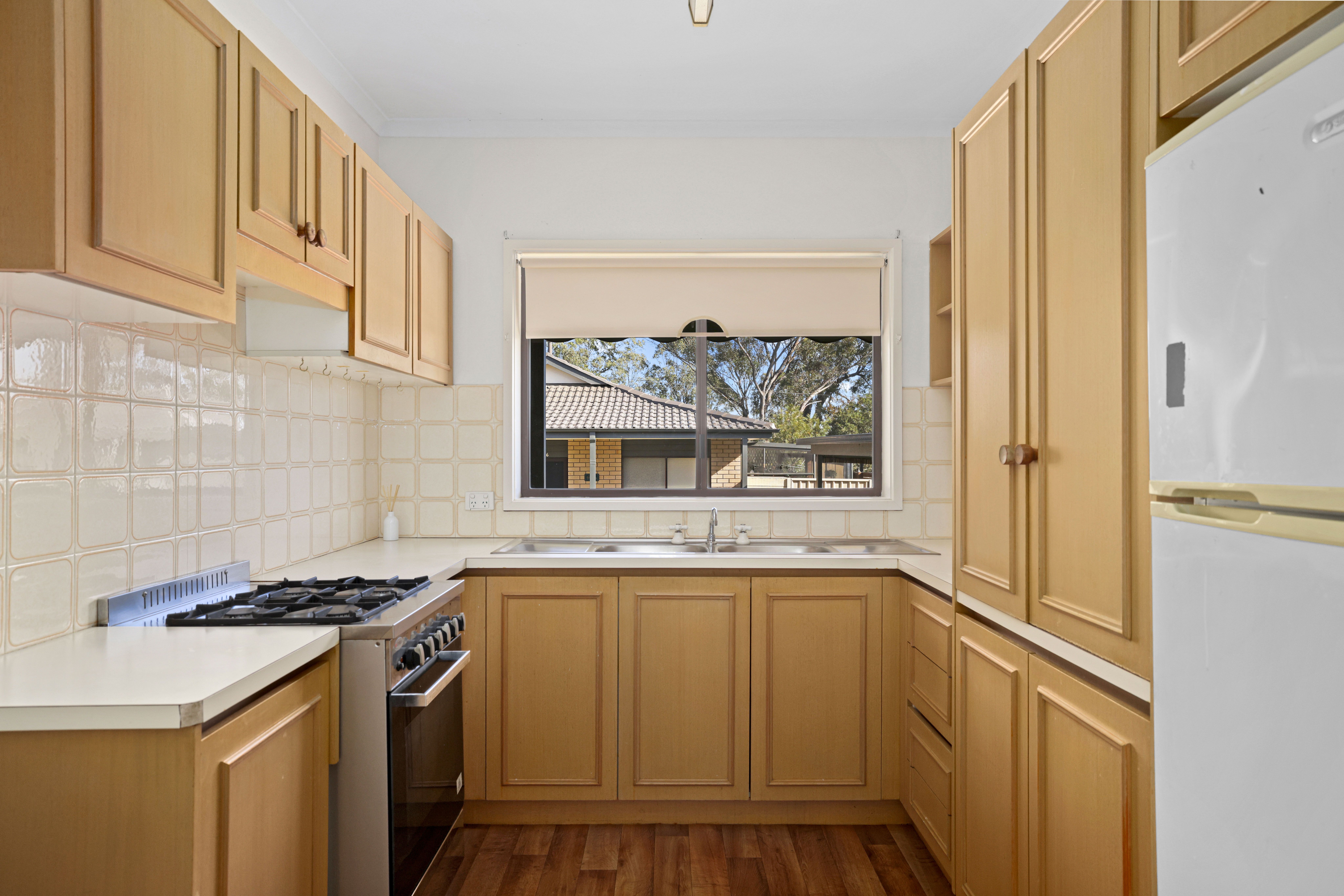 - Functional kitchen with gas cooktop and ample storage and bench space