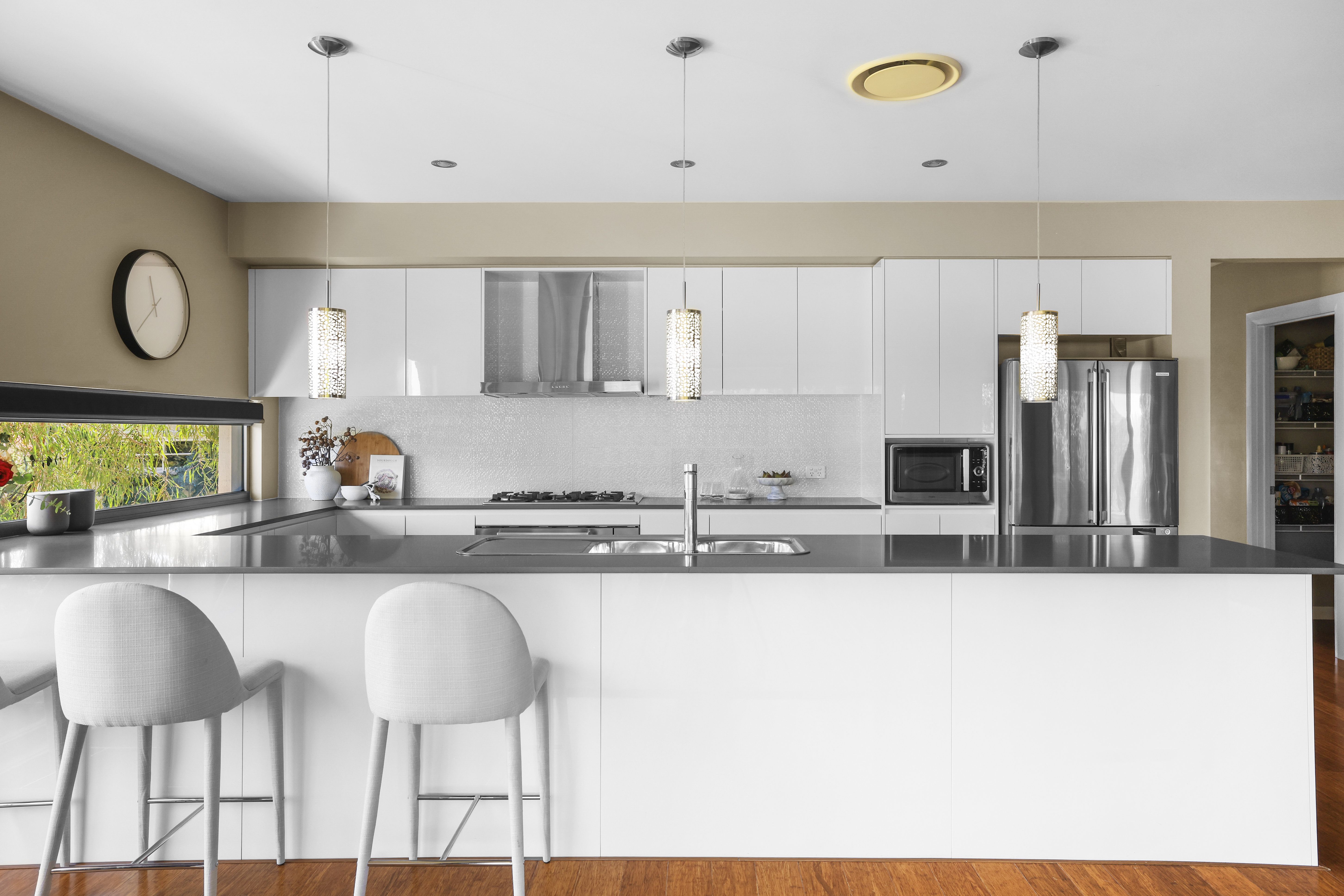 - Sleek modern kitchen features premium appliances and stone benchtop and walk-in pantry