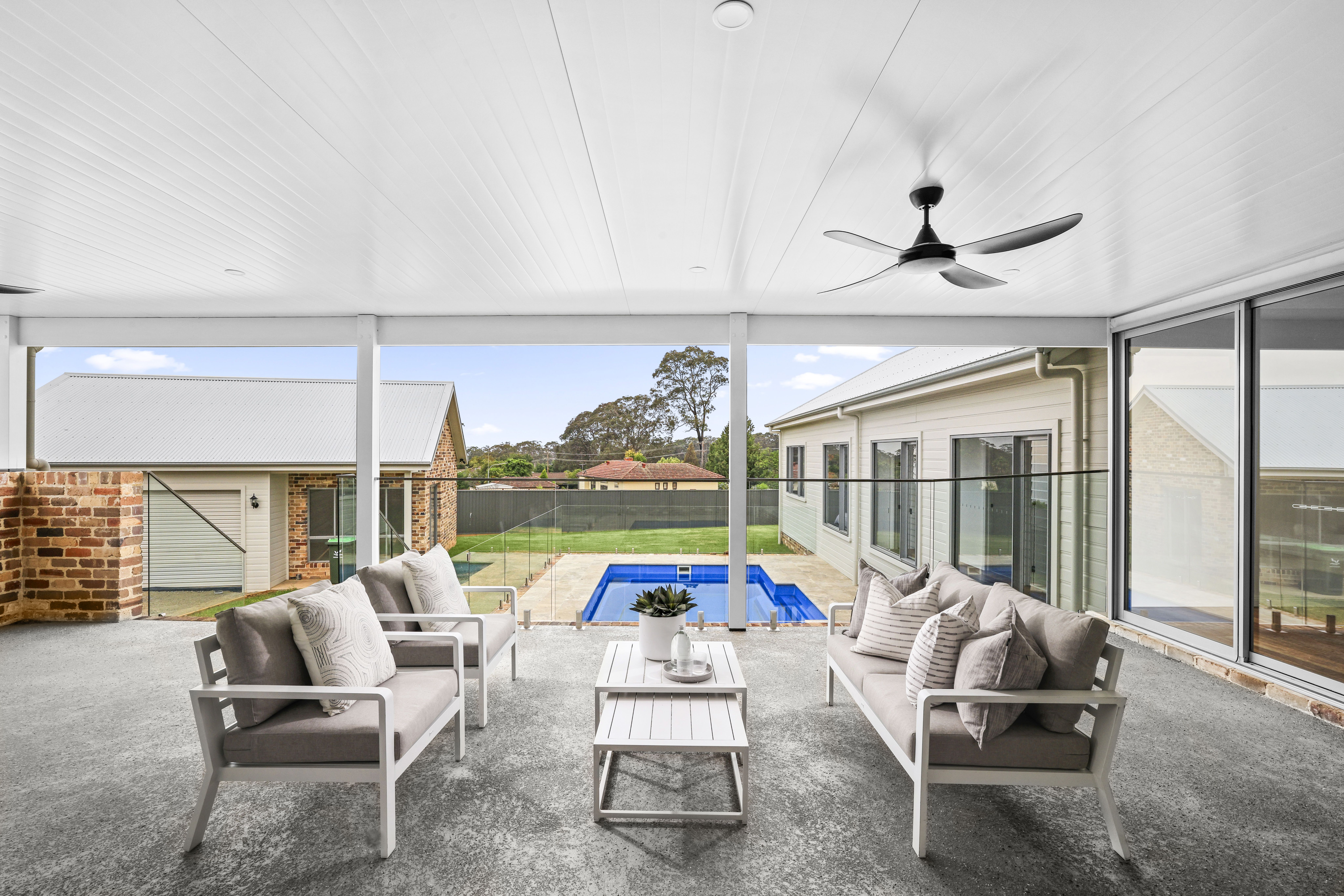 - An exquisite outdoor entertaining area highlighting an exposed brick feature wall, elegant ceiling panelling with downlights plus outdoor power and gas points