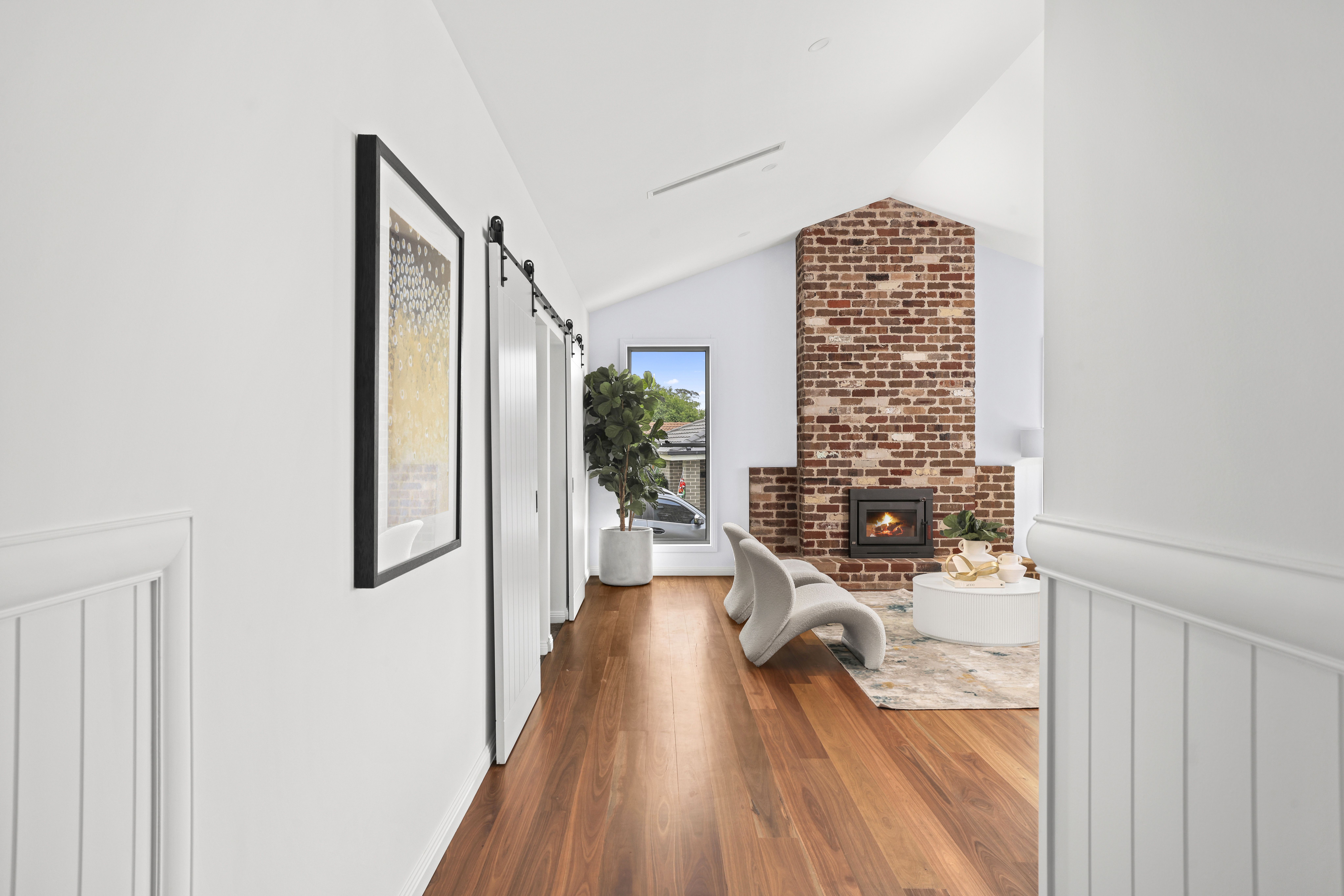 - Ducted air conditioning, feature combustion fireplace with an exposed brick centrepiece and soaring raked ceilings throughout