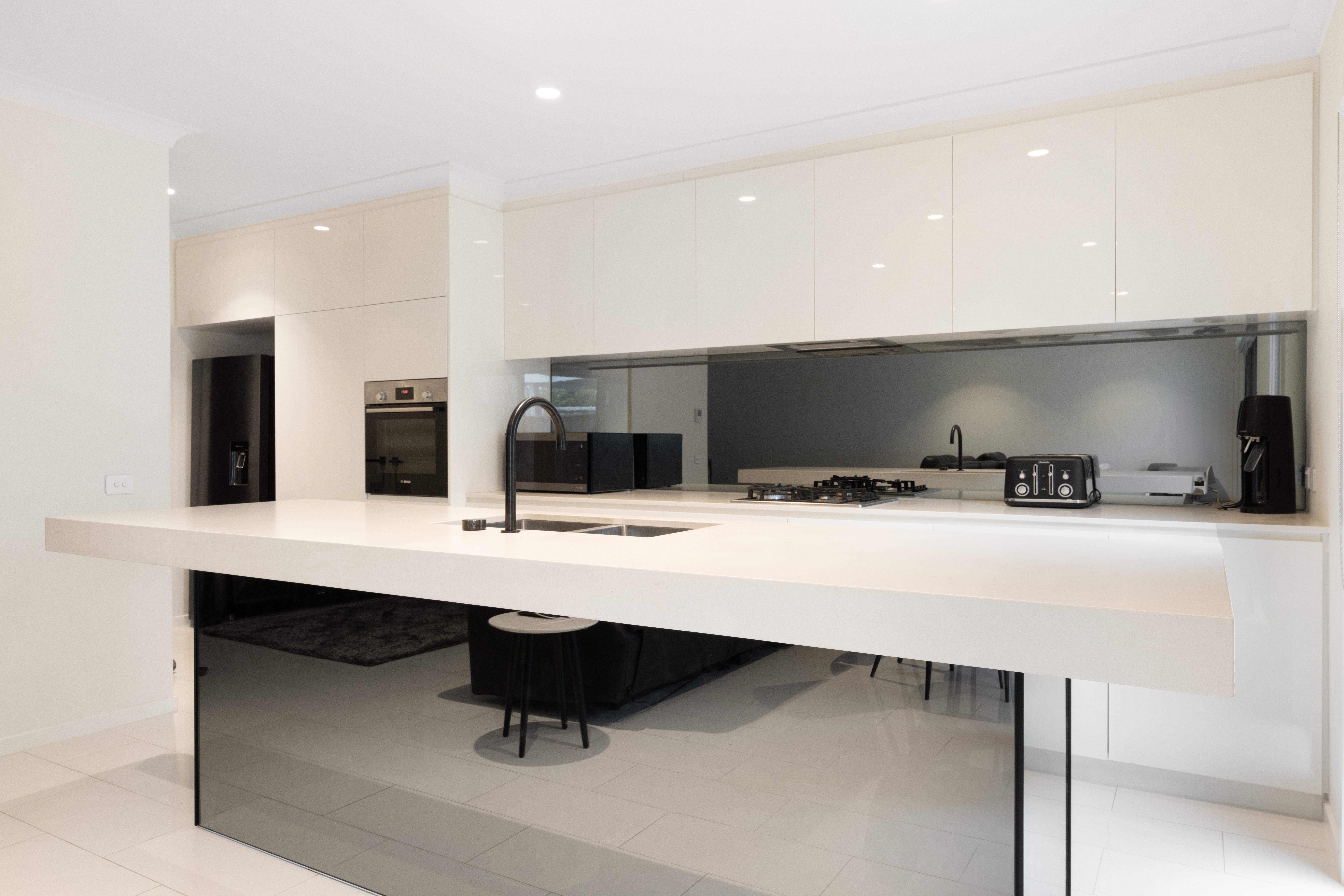 - Sleek kitchen with stone benchtops including reconstituted stone island bench, high gloss cabinetry, and mirror splashback