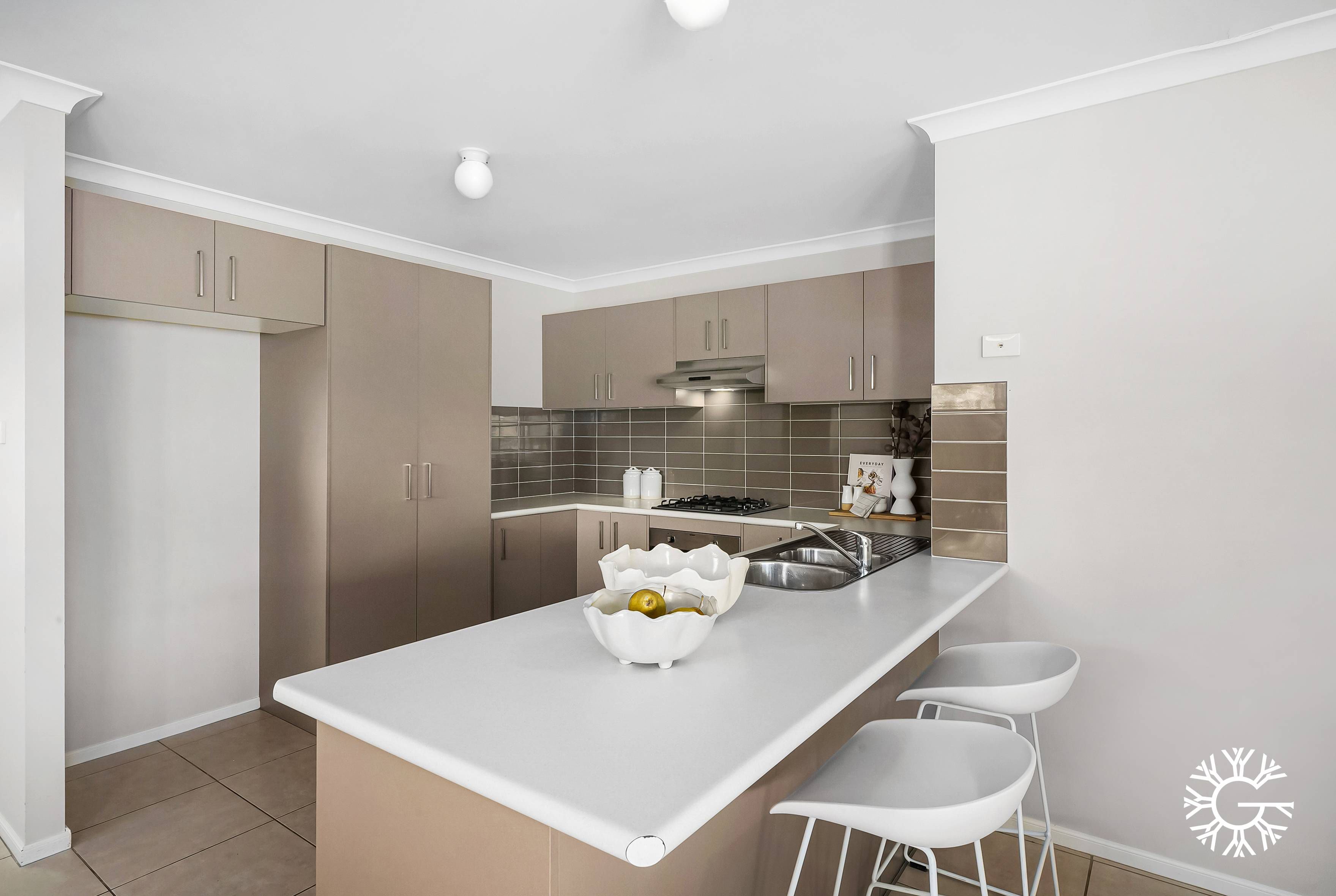 - A modern kitchen with premium cooking appliances, rangehood and tiled splashback