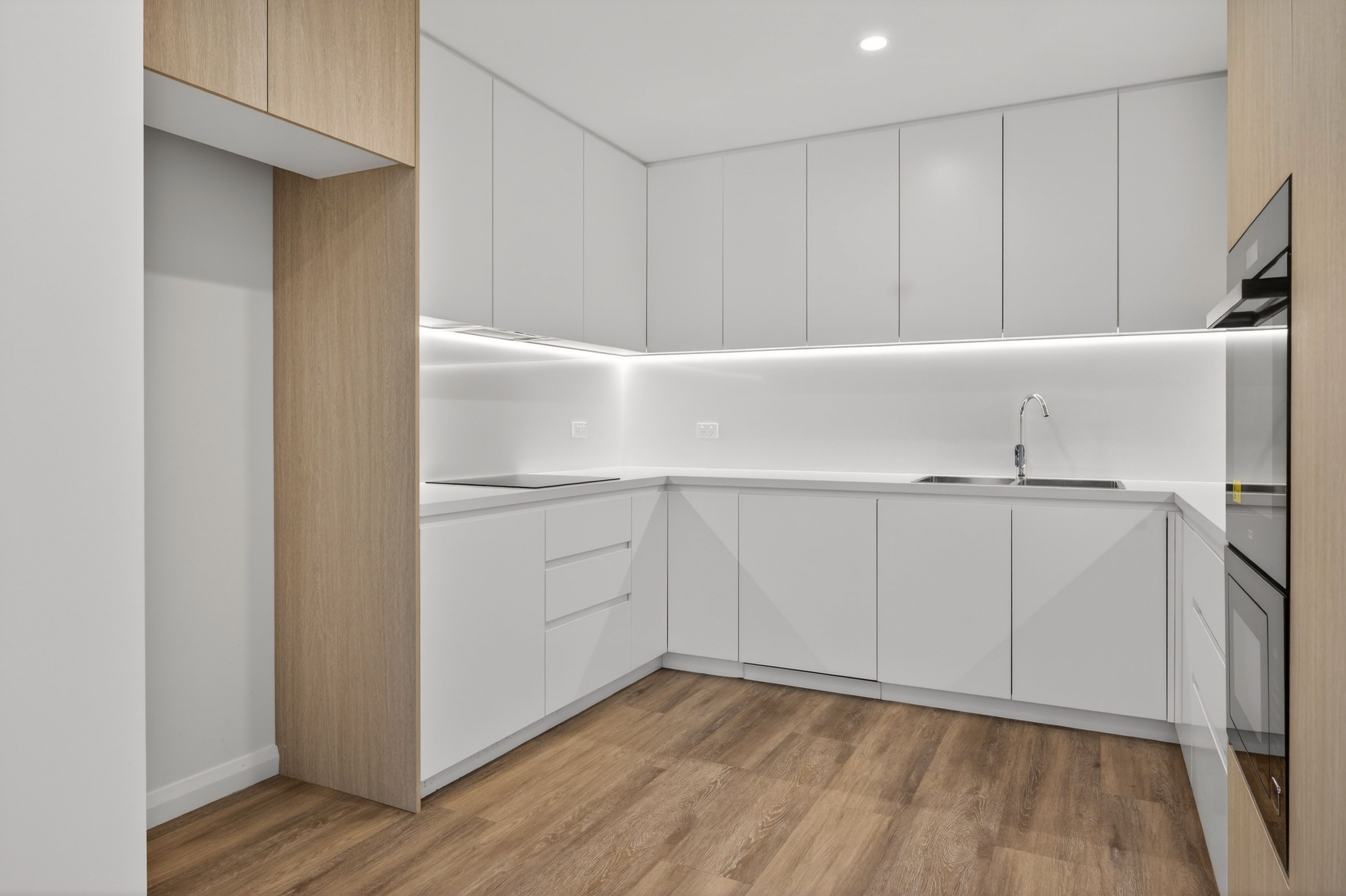 The open-plan living area seamlessly flows onto a generous balcony, perfect for soaking in the natural surroundings. Whether you're enjoying a morning coffee or a sunset view, this outdoor space is an extension of your home, blending indoor and outdoor living. The contemporary kitchen is a chef's dream, with sleek stone benchtops and premium appliances that make meal preparation a joy. For added convenience, the European-style laundry is tucked away, offering practicality without compromising style.