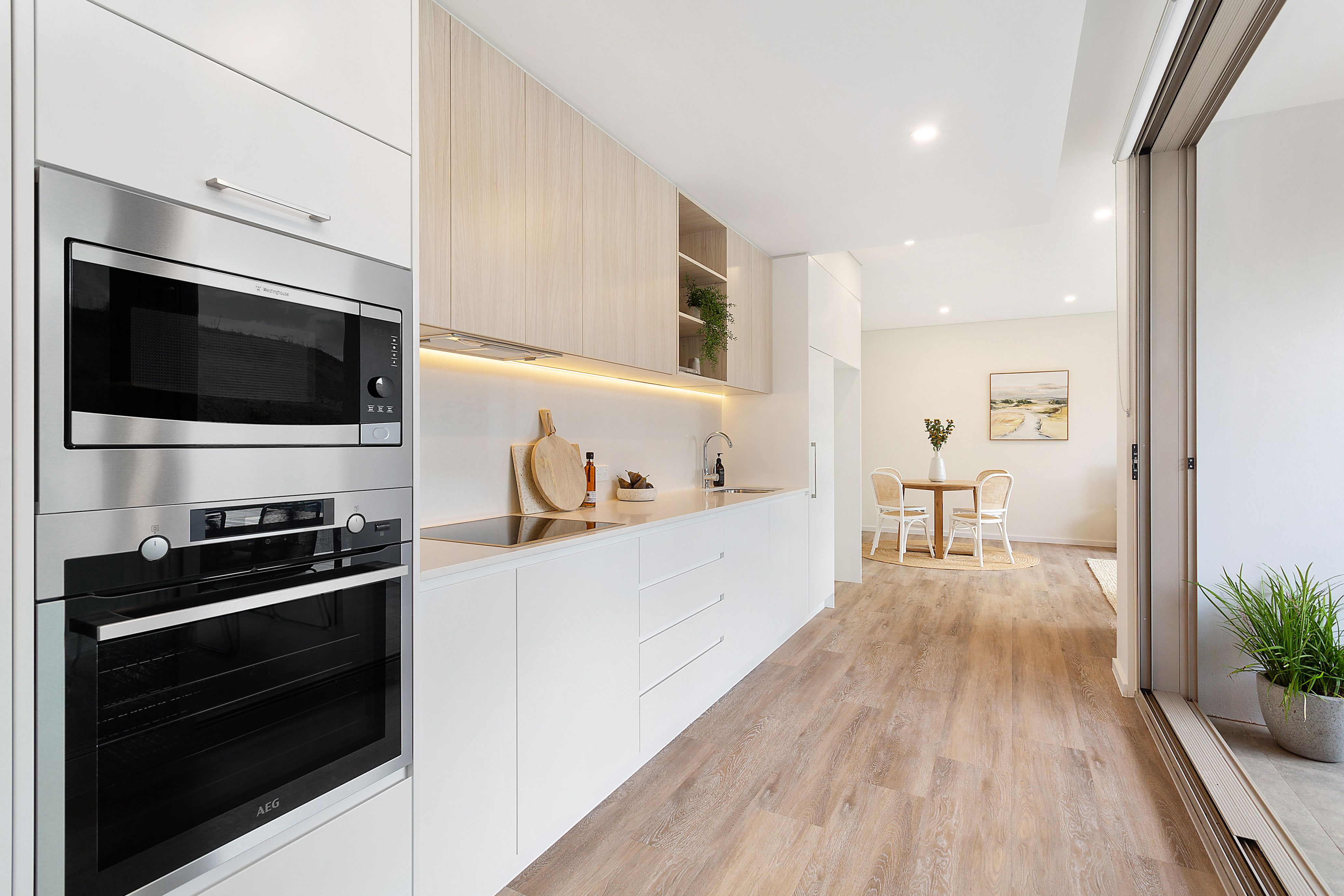 - Galley style kitchen boasts quality AEG stainless steel appliances